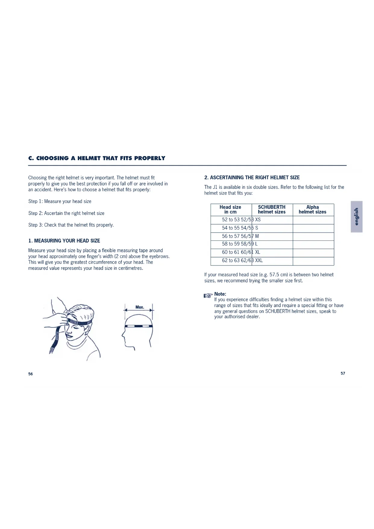 The J1 is available in six double sizes. Refer to the following list for the helmet size that fits you: If your measured head size (e.g. 57.5 cm) is between two helmet sizes, we recommend trying the smaller size first. Note: If you experience difficulties finding a helmet size within this range of sizes that fits ideally and require a special fitting or have any general questions on SCHUBERTH helmet sizes, speak to your authorised dealer. C. CHOOSING A HELMET THAT FITS PROPERLY Choosing the right helmet is very important. The helmet must fit properly to give you the best protection if you fall off or are involved in an accident. Here’s how to choose a helmet that fits properly: Step 1: Measure your head size Step 2: Ascertain the right helmet size Step 3: Check that the helmet fits properly.