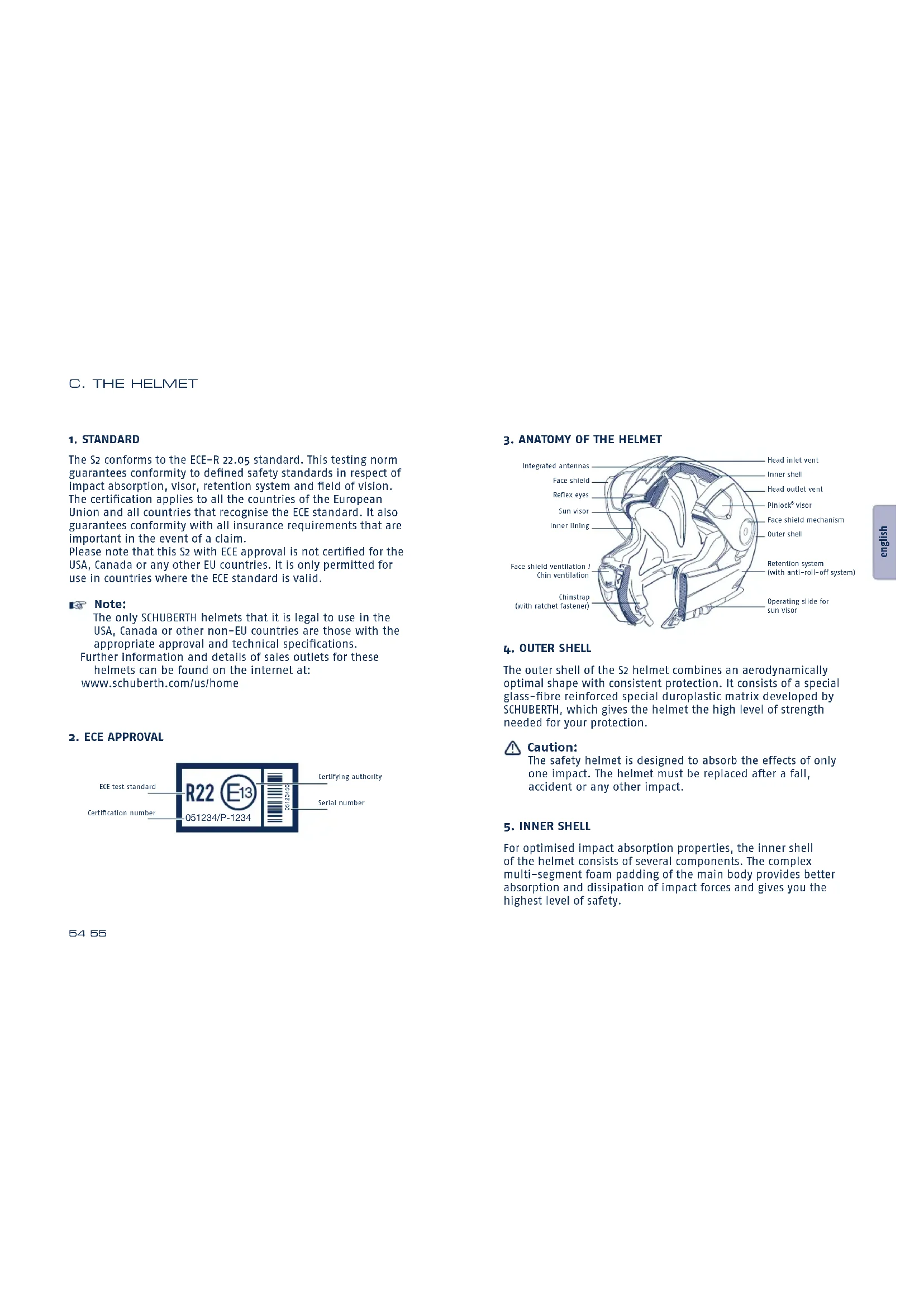 Warnung: Dieser Helm ist nicht für den Gebrauch in den USA und Kanada bestimmt. Dieser Helm ist nach der europäischen ECE-Norm gebaut, geprüft und zugelassen, er entspricht daher nicht den US-amerikanischen und kanadischen Vorschriften und Anforderungen. Er darf nur in Ländern eingesetzt werden, in denen die europäische ECE-Norm Gültigkeit besitzt. Der Gebrauch in anderen Ländern berechtigt im Schadensfall nicht zur Geltendmachung von Ersatzansprüchen vor US-amerikanischen oder kanadischen sowie vor Gerichten dritter nicht ECE-normgebundener Länder.Caution: This helmet is not intended for use in the USA and Canada. The helmet has been inspected and approved to the European ECE Standard and therefore does not conform to US and Canadian regulations and requirements. It is only legal to use the helmet in countries in which the European ECE Standard is valid. If you use the helmet in other countries, you will not in the event of injury be entitled to make a claim for compensation before the US or Canadian courts or the courts of other countries not bound by the ECE Standard.Avertissement: Ce casque n’est pas conçu pour être utilisé aux Etats-Unis ni au Canada. Il a été fabriqué, contrôlé et homologué selon la norme européenne ECE. Par conséquent, il n’est pas conforme aux prescriptions et exigences des Etats-Unis d’Amérique et du Canada. Il ne peut être utilisé que dans les pays où la norme européenne ECE est applicable. En cas d’utilisation du casque dans d‘autres pays, aucun droit de dommages-intérêts ne peut être revendiqué devant les tribunaux des Etats-Unis d’Amérique ou du Canada ou de pays tiers non assujettis à la norme ECE. Note: We reserve the right to make changes that reflect technical advances and to do so without express notice. Congratulations! You have made an excellent choice with the SCHUBERTH S2. The S2 is the result of the very latest design and manufacturing methods. This helmet combines the top characteristics of a sports helmet in terms of aerodynamics and aeroacoustics with the comfort of a flip-up helmet. You can feel secure in the knowledge that you now own a quality helmet that is designed to provide the very highest standards of safety and performance on the road - in particular on long journeys - and that will give you a great deal of pleasure at the same time. We wish you a safe ride. Marcel Lejeune E. Van Hoof CEO International Sales SCHUBERTH GmbH SCHUBERTH GmbH A. HOW TO USE THIS MANUAl CORRECTlY EN52 53 español nederlands italiano français english deutsch F. For your safety .............................................. 83