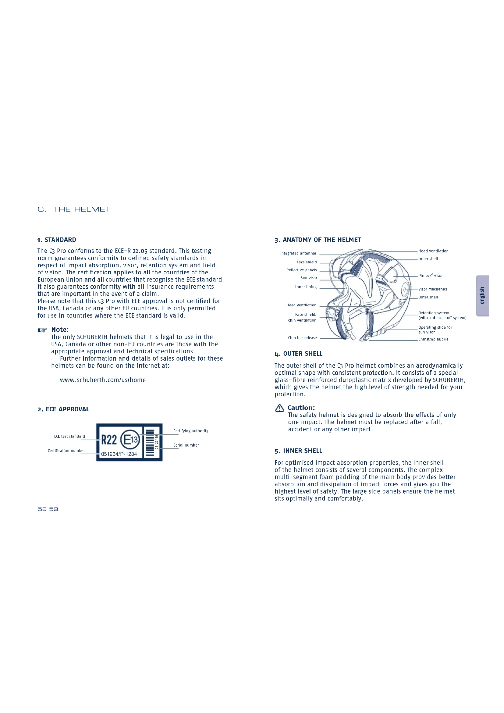 Original components (in particular on the outer shell, inner shell and restraint system) should not be altered or removed. The fitting of additional parts from other manufacturers that have not been recommended can reduce the protective effect and renders the ECE certification and all warranty and insurance claims invalid. Use only original parts, replacement parts and accessories that SCHUBERTH has expressly approved for your helmet! english96 97 english