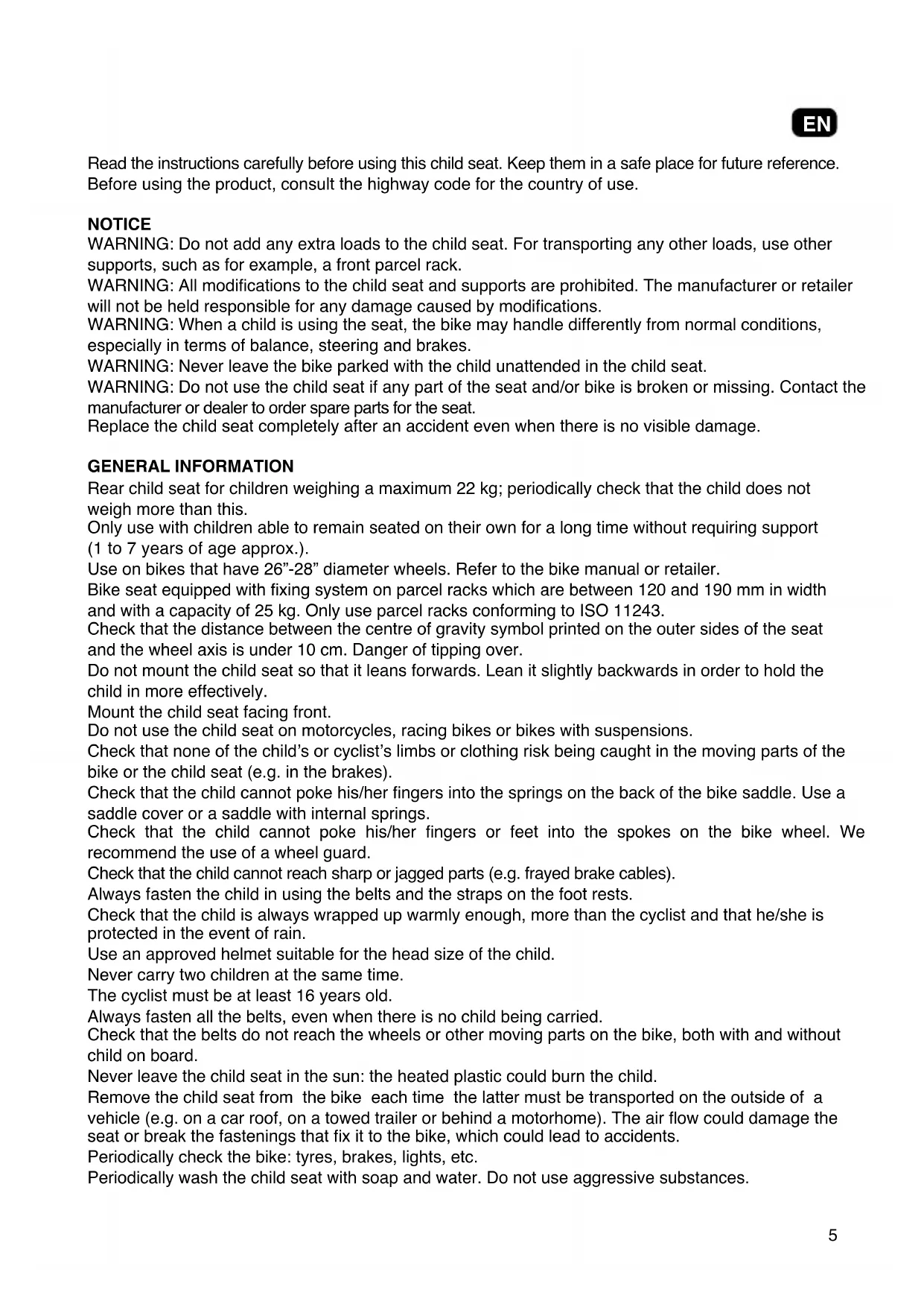 manufacturer or dealer to order spare parts for the seat. Replace the child seat completely after an accident even when there is no visible damage. GENERAL INFORMATION Rear child seat for children weighing a maximum 22 kg; periodically check that the child does not weigh more than this. Only use with children able to remain seated on their own for a long time without requiring support (1 to 7 years of age approx.). Use on bikes that have 26”-28” diameter wheels. Refer to the bike manual or retailer. Bike seat equipped with xing system on parcel racks which are between 120 and 190 mm in width and with a capacity of 25 kg. Only use parcel racks conforming to ISO 11243. Check that the distance between the centre of gravity symbol printed on the outer sides of the seat and the wheel axis is under 10 cm. Danger of tipping over. Do not mount the child seat so that it leans forwards. Lean it slightly backwards in order to hold the child in more effectively. Mount the child seat facing front. Do not use the child seat on motorcycles, racing bikes or bikes with suspensions. Check that none of the child’s or cyclist’s limbs or clothing risk being caught in the moving parts of the bike or the child seat (e.g. in the brakes). Check that the child cannot poke his/her ngers into the springs on the back of the bike saddle. Use a saddle cover or a saddle with internal springs. Check that the child cannot poke his/her ngers or feet into the spokes on the bike wheel. We recommend the use of a wheel guard. Check that the child cannot reach sharp or jagged parts (e.g. frayed brake cables). Always fasten the child in using the belts and the straps on the foot rests. Check that the child is always wrapped up warmly enough, more than the cyclist and that he/she is protected in the event of rain. Use an approved helmet suitable for the head size of the child. Never carry two children at the same time. The cyclist must be at least 16 years old. Always fasten all the belts, even when there is no child being carried. Check that the belts do not reach the wheels or other moving parts on the bike, both with and without child on board. Never leave the child seat in the sun: the heated plastic could burn the child. Remove the child seat from the bike each time the latter must be transported on the outside of a vehicle (e.g. on a car roof, on a towed trailer or behind a motorhome). The air ow could damage the seat or break the fastenings that x it to the bike, which could lead to accidents. Periodically check the bike: tyres, brakes, lights, etc. Periodically wash the child seat with soap and water. Do not use aggressive substances. EN6