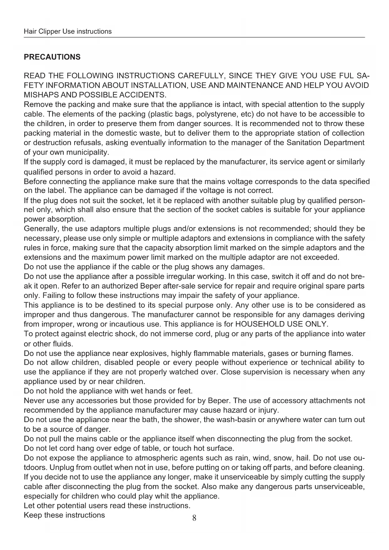 Do not use the appliance after a possible irregular working. In this case, switch it off and do not break it open. Refer to an authorized Beper after-sale service for repair and require original spare parts only. Failing to follow these instructions may impair the safety of your appliance.