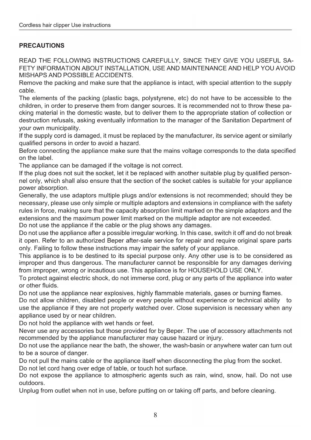 Do not use the appliance after a possible irregular working. In this case, switch it off and do not break it open. Refer to an authorized Beper after-sale service for repair and require original spare parts only. Failing to follow these instructions may impair the safety of your appliance.