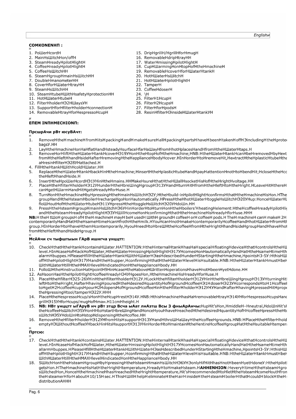 13. Place the filter (25-26) in the filter holder (12). Lock the filter holder (12) in the brewing group (13) turning it from the left to the right, after having poured the desired quantity of ground coffee (1 doser (23) corresponds to 1 coffee dose; to get 2 coffee cups pour 2 dozers of ground coffee in the filter holder (12) ) and after having pressed it properly with the pressing tool/tamper (22). 14. Place the espresso cup/s on the cup rest (14). NB: this machine has a removable tray (14) for espresso cups and a drip grill (15) for cups/mug of max. 11cm height. 15. NB: The coffee switch on the left hand side boiler has 3 positions: up it’s on, middle – neutral, down it’s off. Turn the coffee switch (5) on to start brewing and once you have reached the desired quantity of coffee press the toggle switch (5) down to stop dispensing the coffee. 16. Remove the filter holder (12) from its support (13) and throw away the coffee grounds. NB: Place the filter holder (12) empty (without coffee) back in its support (13) in order to maintain the entire coffee group at the suitable temperature. Steam: 17. Check that the tank contains water. ATTENTION: the internal tank has a special floating device that controls the water level. In case of lack of water, the water missing pilot light (17) comes on automatically and at the same time the sound allarm buzzes. Please fill the water tank with water (as described under Starting the machine, points 3-5): this will shut off the pilot light (17) and the buzzer, confirming that the water level is suitable. NB: the water tank must be filled in with water till the MAX level indicated on the appliance body. 18. Switch on the steam group by pressing the steam main switch (6) (only if it has not been yet done): the pilot light (3) gets on. The machine is at the right temperature, ready to make steam. ATTENTION: every time the steam group is switched on, once the machine has reached the right temperature, it’s recommended to let the steam come out from the steamer for about 10/15 sec. This will help eliminate the air inside the steam boiler that could block the steam distribution!__________________________________________________________________________________________________________________ Pag. 7 English