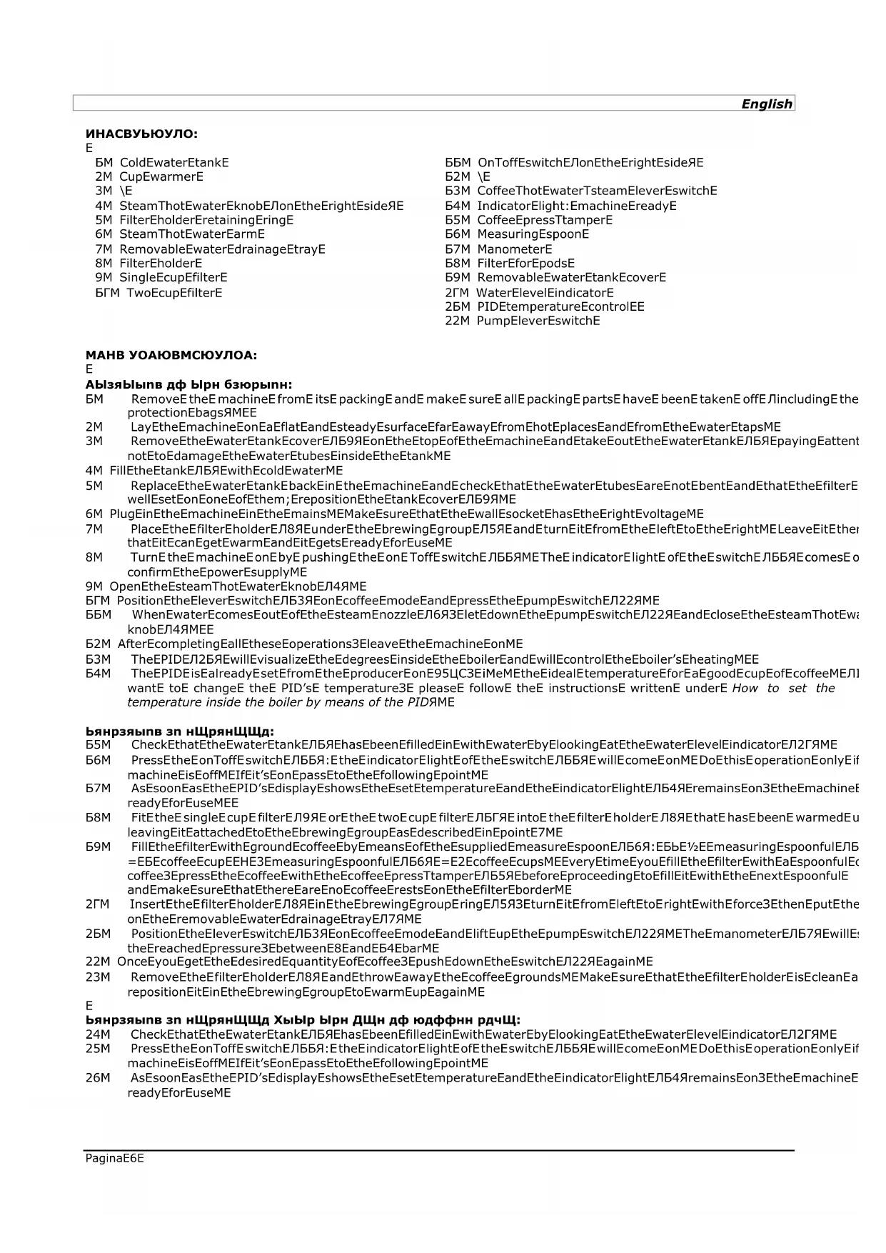 HOW TO SET THE BOILER’S TEMPERATURE BY MEANS OF THE PID: The PID has been set by the producer of this machine on a temperature of 95°C. In order to change the temperature please proceed as follows: - press the button ; as soon as the display shows the writing “PRG” press the button ; - as soon as the display shows the boiler’s temperature, help yourself with the buttons and in order to set the desired temperature, starting from a min. of 80C° up to a max. of 130C°. - after 3 sec. from pressing the last button, the inserted temperature is memorized and the display shows the set temperature. NB: if the temperature is set too high, once a coffee request is made, the display starts to flash. USEFUL TIPS: - The single cup filter (9), the two cup filter (10) and the pod filter (18) do not need to be washed after each use but please check that the holes are not blocked. - For best results, we suggest warming the cups up on the cup warmer (2) which works only when the machine is on. - The PID is already set by the producer on the right temperature for an excellent espresso. During heating and coffee or water distribution, the temperature can oscillate (+/- 10/12°C). Also, a warning has been inserted: after 108°C the PID’s display shows the temperature but intermittently; this is normal and it warns the user that the coffee will not be good if made with such high temperature. ROUTINE MAINTANCE AND PRECAUTIONS: - It is recommended to clean, after each use, the steam arm (6) and the strainer holder (8) carefully. - For cleaning it is recommended the use of a wet damp cloth. - Do not leave the machine outdoor. And do not immerse the machine in water. - The machine can be used only by adults and must be kept away from children. - Do not wash strainer and strainer holder in dishwasherPagina 8 English TECNICAL DATA: Voltage: 230 V – 50 Hz; PL41TEM/110 – 120V-60 Hz Power: 1050 W Heating time: ca. 3 min. Pump pressure: 15 bar PID’s regulation: from 80°C up to 130°C Water tank: 2,7 litres Dimensions (HxLxD): 34*23*27 cm Weight: 7,5 kg To be operated with ground coffee and coffee pods TROUBLESHOOTING: We thank you for buying one of our products, projected and assembled in accordance with the most up-to date technological innovations. Following carefully the simple operations described in this manual, which respect all essential safety regulations, you will get the best performances and will appreciate the remarkable reliability of this product in the years to come. Please find below the description of the most frequent problems and of their solution: