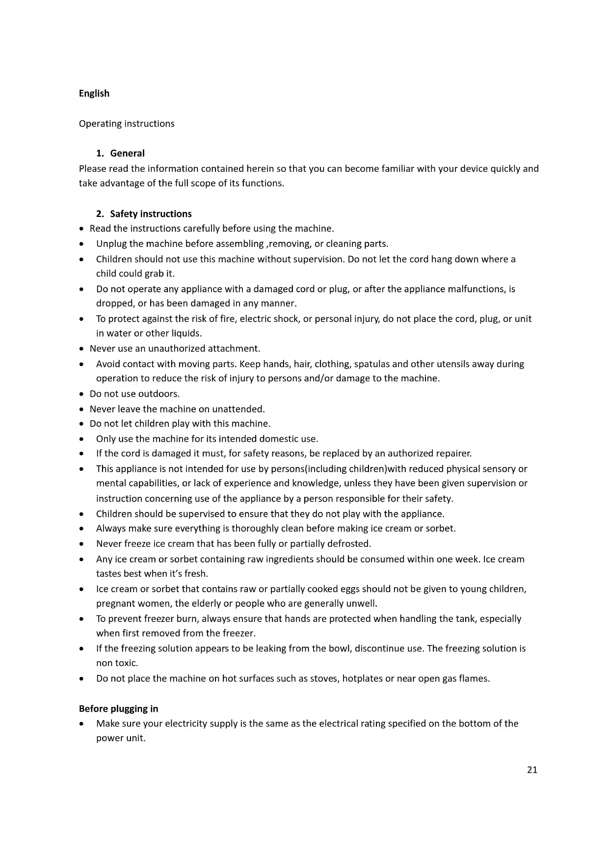 Device type Ice Cream Maker Model 99254 Voltage supply 220~240V 50/60Hz Power consumption 7W Capacity during operation 0.8L Production class II Net weight 1520g26