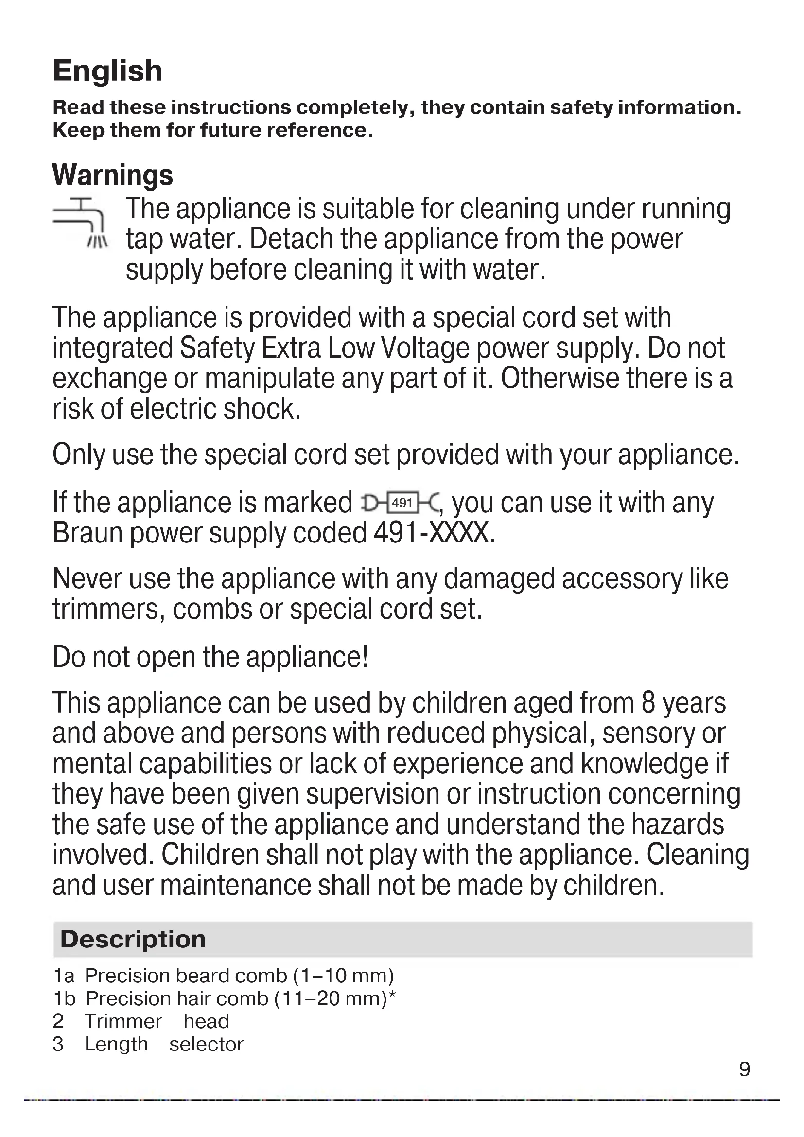 , you can use it with any Braun power supply coded 491-XXXX. Never use the appliance with any damaged accessory like trimmers, combs or special cord set. Do not open the appliance! This appliance can be used by children aged from 8 years and above and persons with reduced physical, sensory or mental capabilities or lack of experience and knowledge if they have been given supervision or instruction concerning the safe use of the appliance and understand the hazards involved. Children shall not play with the appliance. Cleaning and user maintenance shall not be made by children. Description 1a Precision beard comb (1–10 mm) 1b Precision hair comb (11–20 mm)* 2 Trimmer head 3 Length selector 90640279_BT_3242_3241_3240_3940_MN_ANZ.indd 990640279_BT_3242_3241_3240_3940_MN_ANZ.indd 9 15.05.19 10:2615.05.19 10:26 Business Use - P&G AUTHORIZED POA-00132899 Rev 001 Effective Date 2019-05-23 Printed 2020-10-06 Page 9 of 5210 4 On/off button 5 Charging indicator 6 Power socket 7 Special cord set (design can differ)