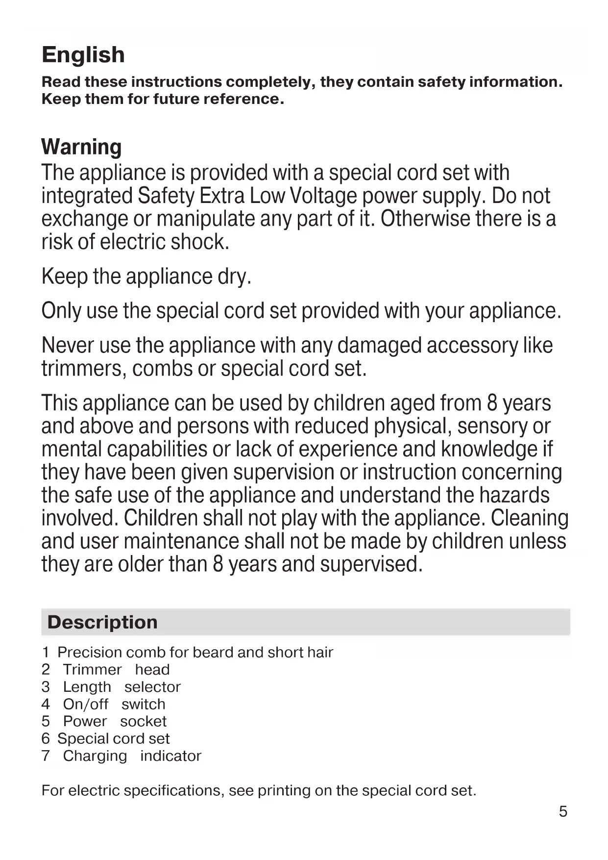 91320161_BT_3020_CEEMEA.indd 491320161_BT_3020_CEEMEA.indd 4 04.01.17 14:0804.01.17 14:08 CSS APPROVED Effective Date 12Jan2017 GMT - Printed 05Apr2017 Page 4 of 605 English Read these instructions completely, they contain safety information. Keep them for future reference. Warning The appliance is provided with a special cord set with integrated Safety Extra Low Voltage power supply. Do not exchange or manipulate any part of it. Otherwise there is a risk of electric shock. Keep the appliance dry. Only use the special cord set provided with your appliance. Never use the appliance with any damaged accessory like trimmers, combs or special cord set. This appliance can be used by children aged from 8 years and above and persons with reduced physical, sensory or mental capabilities or lack of experience and knowledge if they have been given supervision or instruction concerning the safe use of the appliance and understand the hazards involved. Children shall not play with the appliance. Cleaning and user maintenance shall not be made by children unless they are older than 8 years and supervised. Description 1 Precision comb for beard and short hair 2 Trimmer head 3 Length selector 4 On/off switch 5 Power socket 6 Special cord set 7 Charging indicator For electric specifications, see printing on the special cord set. 91320161_BT_3020_CEEMEA.indd 591320161_BT_3020_CEEMEA.indd 5 04.01.17 14:0804.01.17 14:08 CSS APPROVED Effective Date 12Jan2017 GMT - Printed 05Apr2017 Page 5 of 606 Charging Recommended ambient temperature for charging is 5 °C to 35 °C. The battery may not charge properly or at all under extreme low or high temperatures. Recommended ambient temperature for trimming is 15 °C to 35 °C. Do not expose the appliance to temperatures higher than 50 °C for extended periods of time.