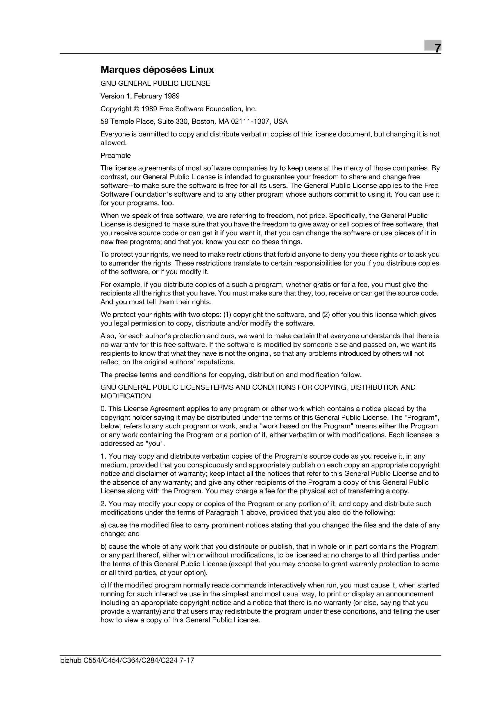 Version 2, June 1991 Copyright © 1989, 1991 Free Software Foundation, Inc., 51 Franklin Street, Fifth Floor, Boston, MA 02110-1301 USA Everyone is permitted to copy and distribute verbatim copies of this license document, but changing it is not allowed. Preamble The licenses for most software are designed to take away your freedom to share and change it. By contrast, the GNU General Public License is intended to guarantee your freedom to share and change free software-- to make sure the software is free for all its users. This General Public License applies to most of the Free Software Foundation's software and to any other program whose authors commit to using it. (Some other Free Software Foundation software is covered by the GNU Lesser General Public License instead.) You can apply it to your programs, too.7 7-20 bizhub C554/C454/C364/C284/C224 When we speak of free software, we are referring to freedom, not price. Our General Public Licenses are designed to make sure that you have the freedom to distribute copies of free software (and charge for this service if you wish), that you receive source code or can get it if you want it, that you can change the software or use pieces of it in new free programs; and that you know you can do these things. To protect your rights, we need to make restrictions that forbid anyone to deny you these rights or to ask you to surrender the rights. These restrictions translate to certain responsibilities for you if you distribute copies of the software, or if you modify it. For example, if you distribute copies of such a program, whether gratis or for a fee, you must give the recipients all the rights that you have. You must make sure that they, too, receive or can get the source code. And you must show them these terms so they know their rights. We protect your rights with two steps: (1) copyright the software, and (2) offer you this license which gives you legal permission to copy, distribute and/or modify the software. Also, for each author's protection and ours, we want to make certain that everyone understands that there is no warranty for this free software. If the software is modified by someone else and passed on, we want its recipients to know that what they have is not the original, so that any problems introduced by others will not reflect on the original authors' reputations. Finally, any free program is threatened constantly by software patents. We wish to avoid the danger that redistributors of a free program will individually obtain patent licenses, in effect making the program proprietary. To prevent this, we have made it clear that any patent must be licensed for everyone's free use or not licensed at all. The precise terms and conditions for copying, distribution and modification follow.