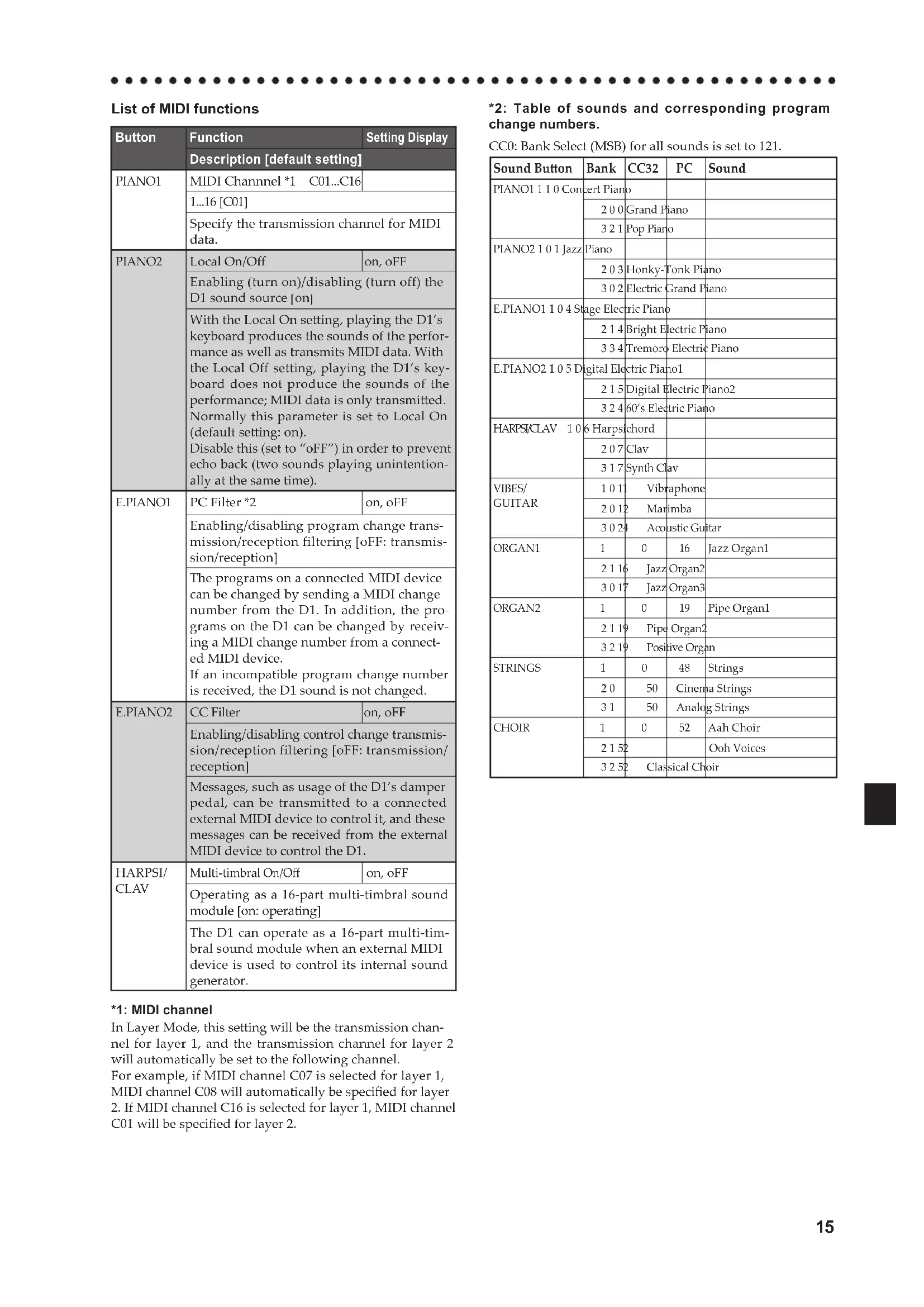 - The D1’s piano sounds replicate the sound of an actual piano as faithfully as possible. This means that in some regions of the keyboard, you may feel that the over- tones seem stronger, or that the tone or pitch seems wrong. This is not a malfunction. The connected MIDI device does not respond to trans- mitted MIDI data