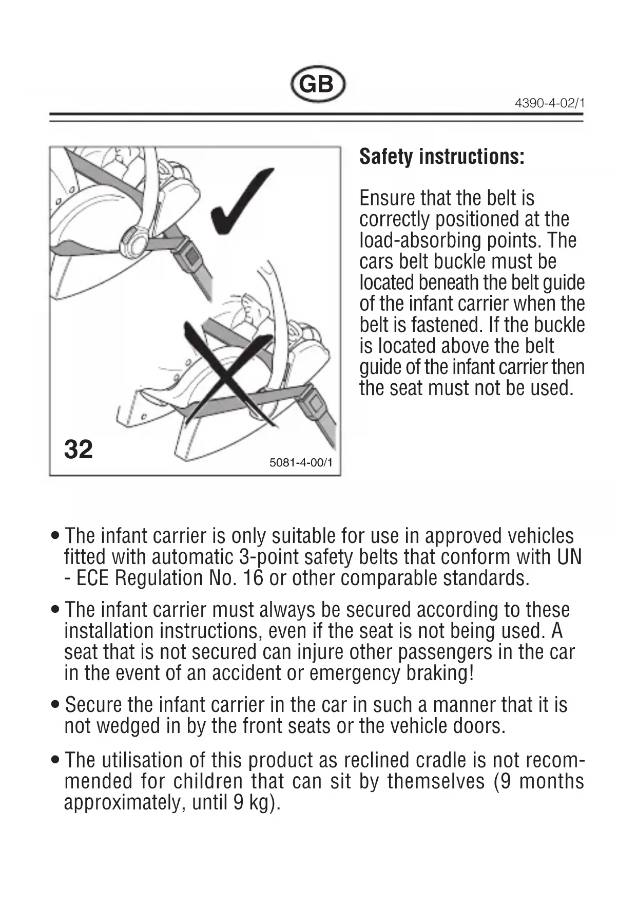 - The infant carrier is only suitable for use in approved vehicles fitted with automatic 3-point safety belts that conform with UN - ECE Regulation No. 16 or other comparable standards.