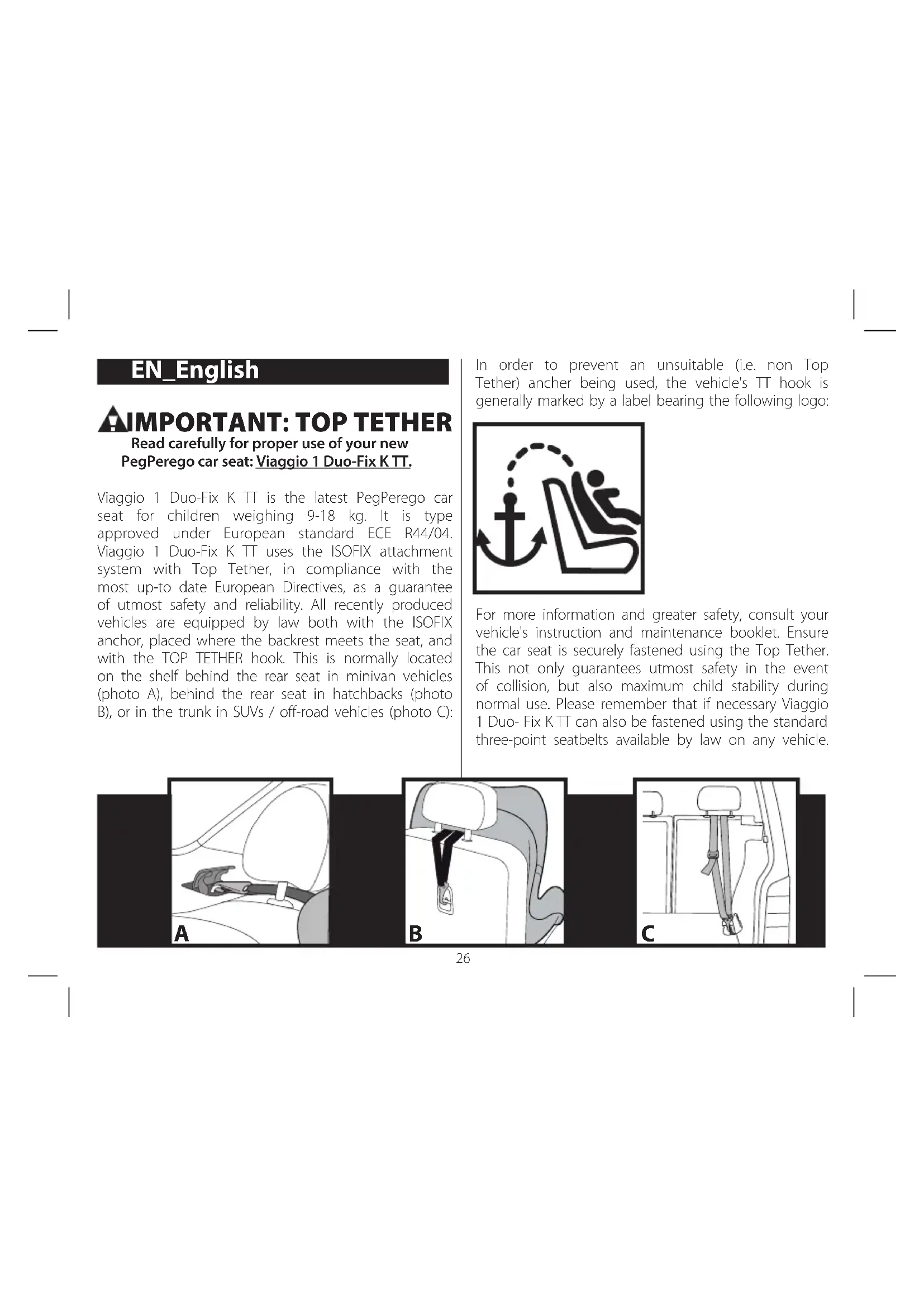 Read carefully for proper use of your new PegPerego car seat: Viaggio 1 Duo-Fix K TT. Viaggio 1 Duo-Fix K TT is the latest PegPerego car seat for children weighing 9-18 kg. It is type approved under European standard ECE R44/04. Viaggio 1 Duo-Fix K TT uses the ISOFIX attachment system with Top Tether, in compliance with the most up-to date European Directives, as a guarantee of utmost safety and reliability. All recently produced vehicles are equipped by law both with the ISOFIX anchor, placed where the backrest meets the seat, and with the TOP TETHER hook. This is normally located on the shelf behind the rear seat in minivan vehicles (photo A), behind the rear seat in hatchbacks (photo B), or in the trunk in SUVs / off-road vehicles (photo C): BA C Thank you for choosing a Peg-Perego product. Product characteristics Car seat, Group 1, “Universal” category with vehicle seatbelt