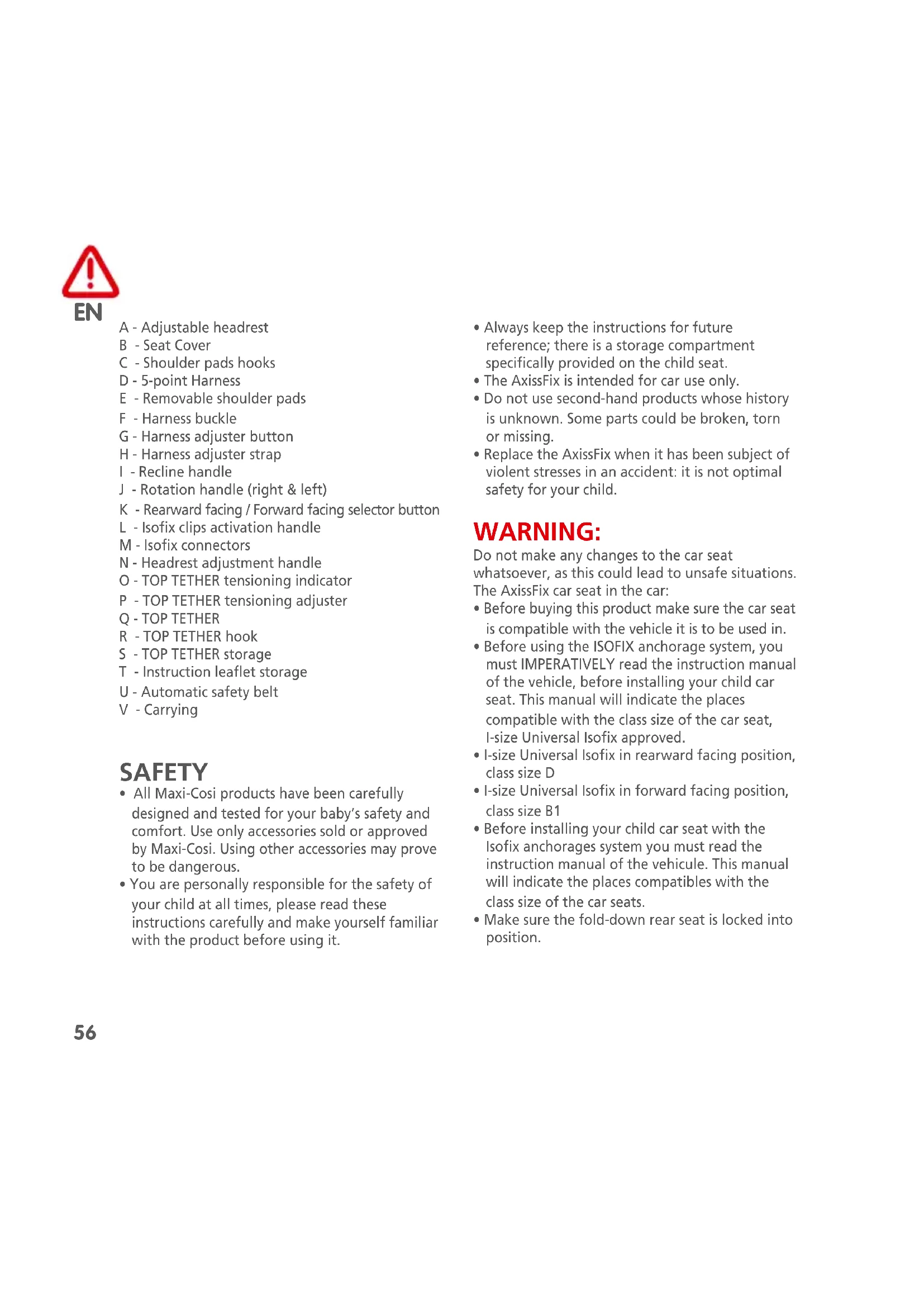 - Clean the shell using a damp cloth. Environment Keep plastic covering away from children to avoid suffocation. For environmental reasons, when you have stopped using this product, we ask that you dispose of the product in the proper waste facilities in accordance with local legislation. Questions Please contact your local Maxi-Cosi distributor or on our website, www.maxi-cosi.com in the part “Our services”. When doing so please have the following information to hand: - Serial number - Make and type of car and seat on which the AxissFix is used. - Age, height and weight of your child. Warranty Our 24 months warranty reflects our confidence in the high quality of our design, engineering, production and product performance. We confirm that this product was manufactured in accordance with the current European safety requirements and quality standards which are applicable to this product, and that this product is free from defects on materials and workmanship at the time of purchase. 59(