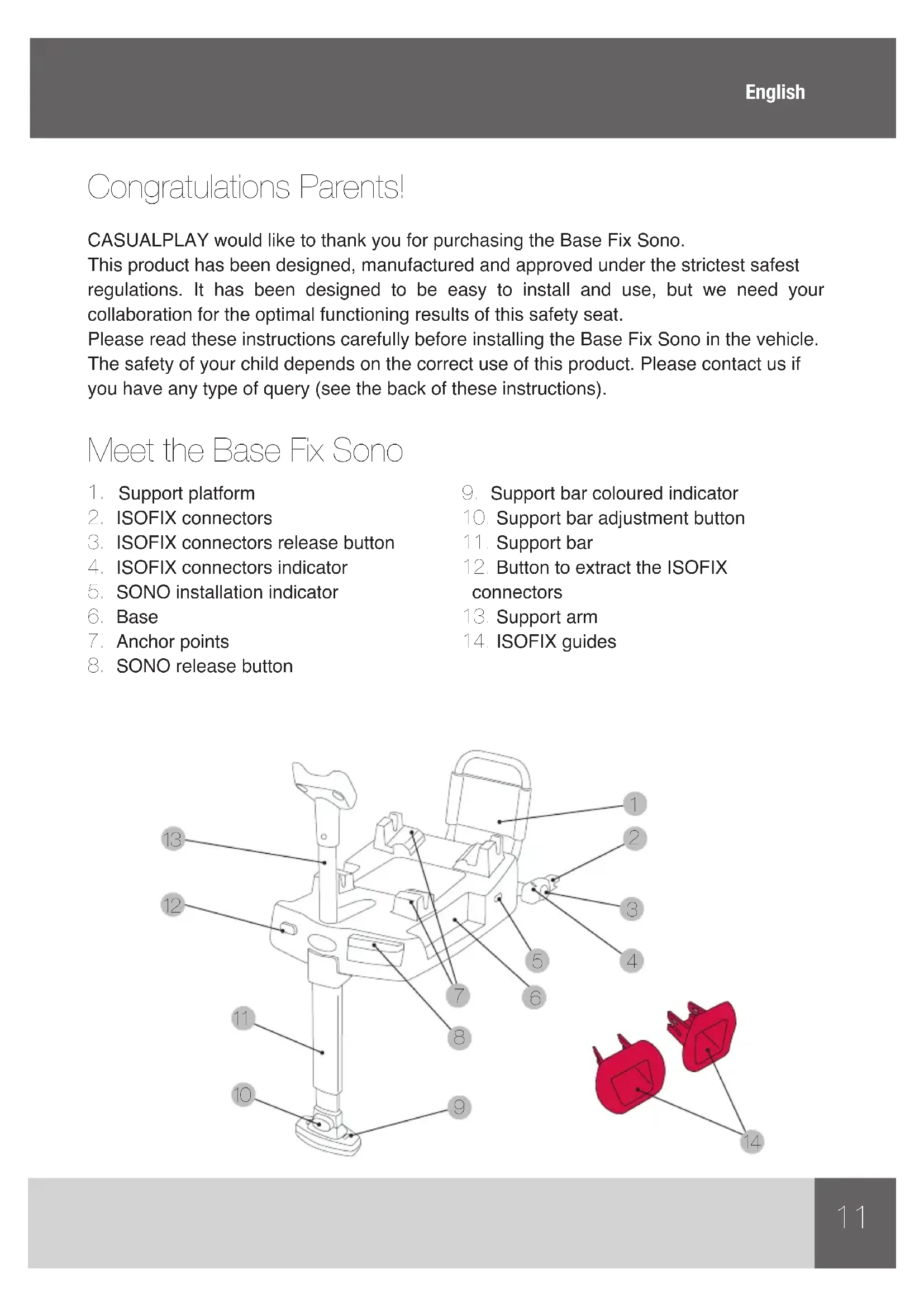 Congratulations Parents! CASUALPLAY would like to thank you for purchasing the Base Fix Sono. This product has been designed, manufactured and approved under the strictest safest regulations. It has been designed to be easy to install and use, but we need your collaboration for the optimal functioning results of this safety seat. Please read these instructions carefully before installing the Base Fix Sono in the vehicle. The safety of your child depends on the correct use of this product. Please contact us if you have any type of query (see the back of these instructions). Meet the Base Fix Sono English