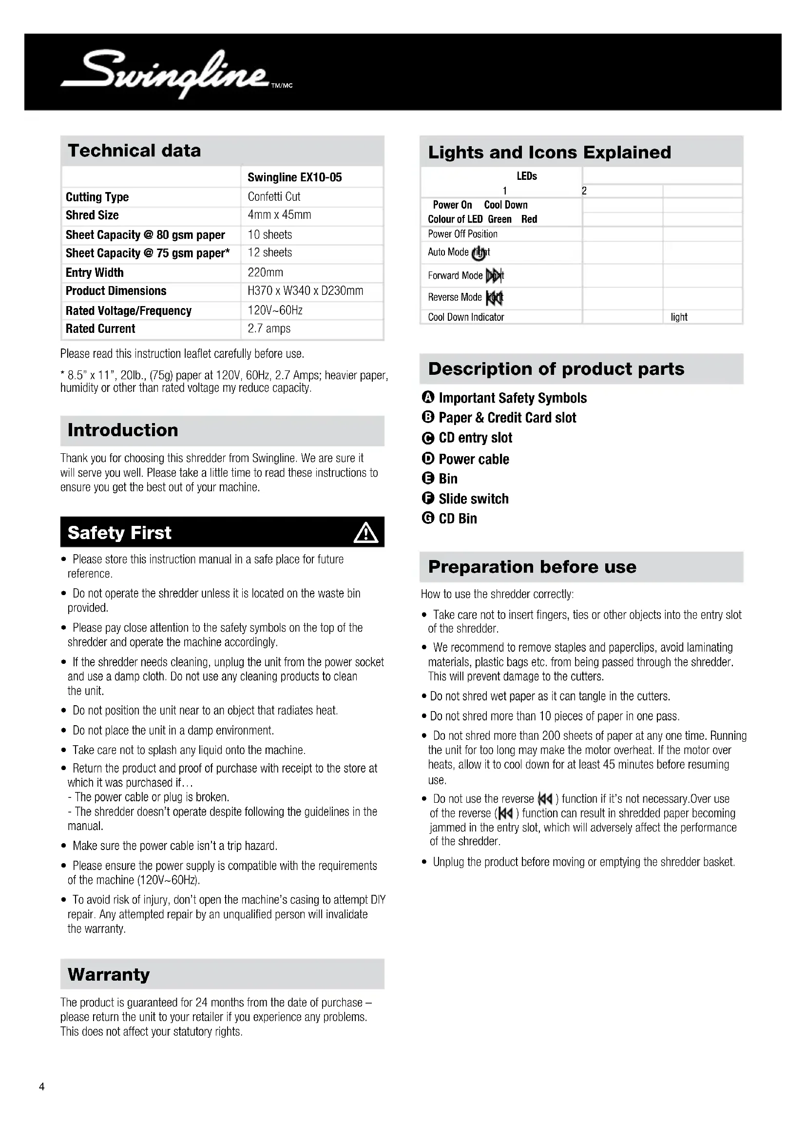 Introduction Thank you for choosing this shredder from Swingline. We are sure it will serve you well. Please take a little time to read these instructions to ensure you get the best out of your machine. Please read this instruction leaet carefully before use.