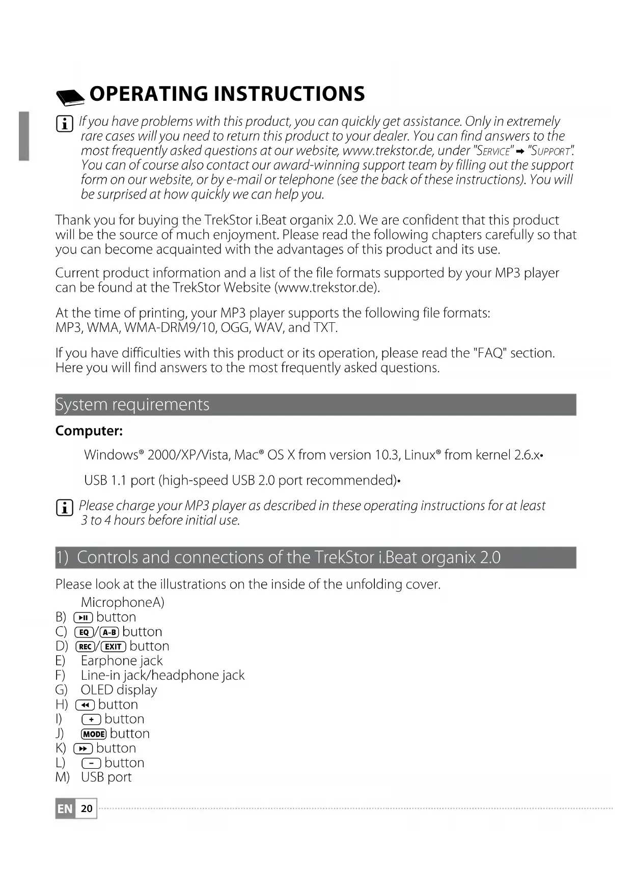 If you have problems with this product, you can quickly get assistance. Only in extremely rare cases will you need to return this product to your dealer. You can find answers to the most frequently asked questions at our website, www.trekstor.de, under "Se r v i c e " + "Su p p o r t ". You can of course also contact our award-winning support team by filling out the support form on our website, or by e-mail or telephone (see the back of these instructions). You will be surprised at how quickly we can help you. Thank you for buying the TrekStor i.Beat organix 2.0. We are confident that this product will be the source of much enjoyment. Please read the following chapters carefully so that you can become acquainted with the advantages of this product and its use. Current product information and a list of the file formats supported by your MP3 player can be found at the TrekStor Website (www.trekstor.de). At the time of printing, your MP3 player supports the following file formats: MP3, WMA, WMA-DRM9/10, OGG, WAV, and TXT. If you have difficulties with this product or its operation, please read the "FAQ" section. Here you will find answers to the most frequently asked questions. System requirements Computer: Windows® 2000/XP/Vista, Mac® OS X from version 10.3, Linux® from kernel 2.6.x• USB 1.1 port (high-speed USB 2.0 port recommended)•