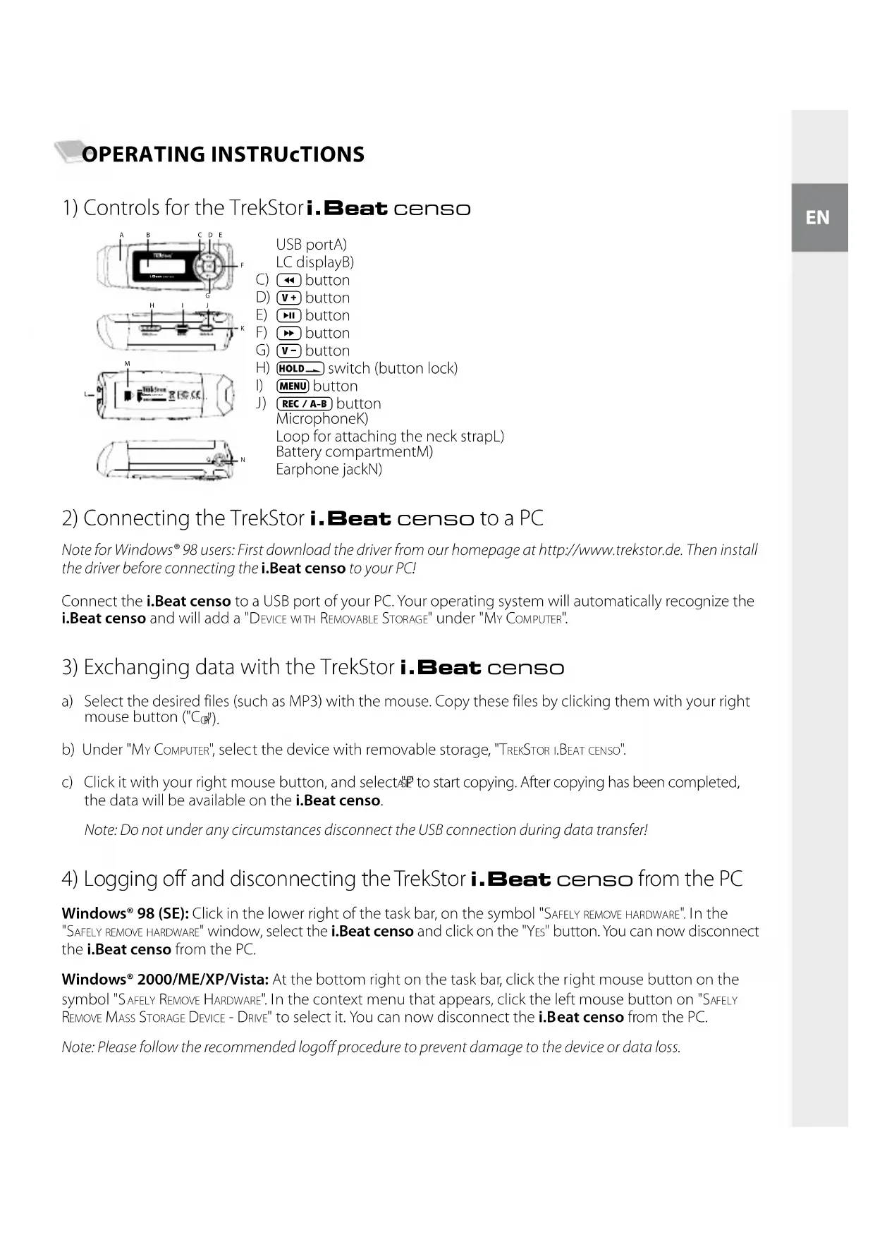 a) Select the desired files (such as MP3) with the mouse. Copy these files by clicking them with your right mouse button ("c o p y "). b) Under "M y co M p U t e r ", select the device with removable storage, "tr e K st o r i.be A t c e n s o ". c) Click it with your right mouse button, and select "p A s t e " to start copying. After copying has been completed, the data will be available on the i.Beat censo. Note: Do not under any circumstances disconnect the USB connection during data transfer!