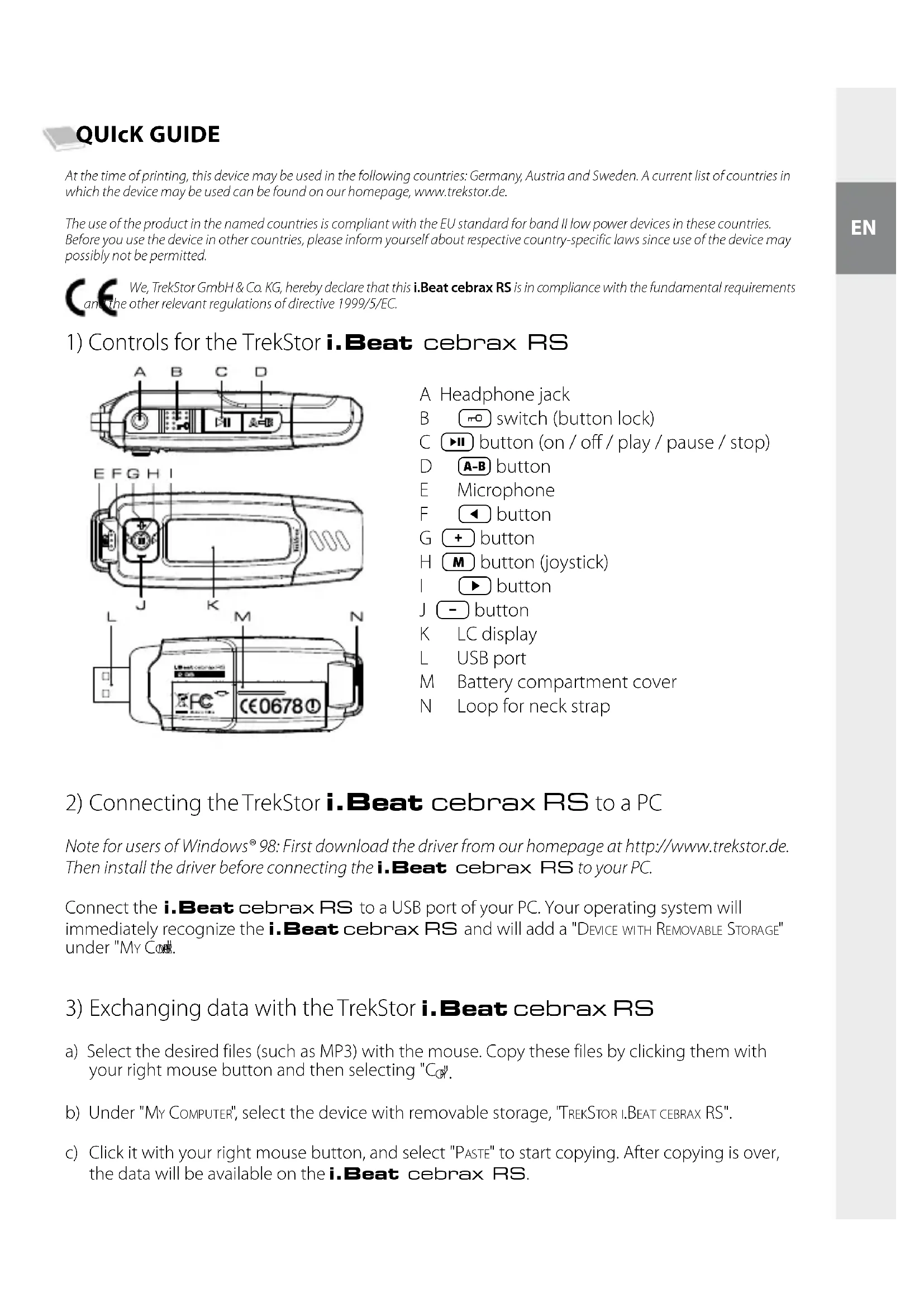 a) Select the desired files (such as MP3) with the mouse. Copy these files by clicking them with your right mouse button and then selecting "c o p y ". b) Under "m y co m p u t e r ", select the device with removable storage, "tr e K st o r i.be A t c e b r A x rs". c) Click it with your right mouse button, and select "pA s t e " to start copying. After copying is over, the data will be available on the i.Beat cebrax RS. A Headphone jack B switch (button lock) C button (on / off / play / pause / stop) D button E Microphone F button G button H button (joystick) I button J button K LC display L USB port M Battery compartment cover N Loop for neck strap– 8 – – 9 –