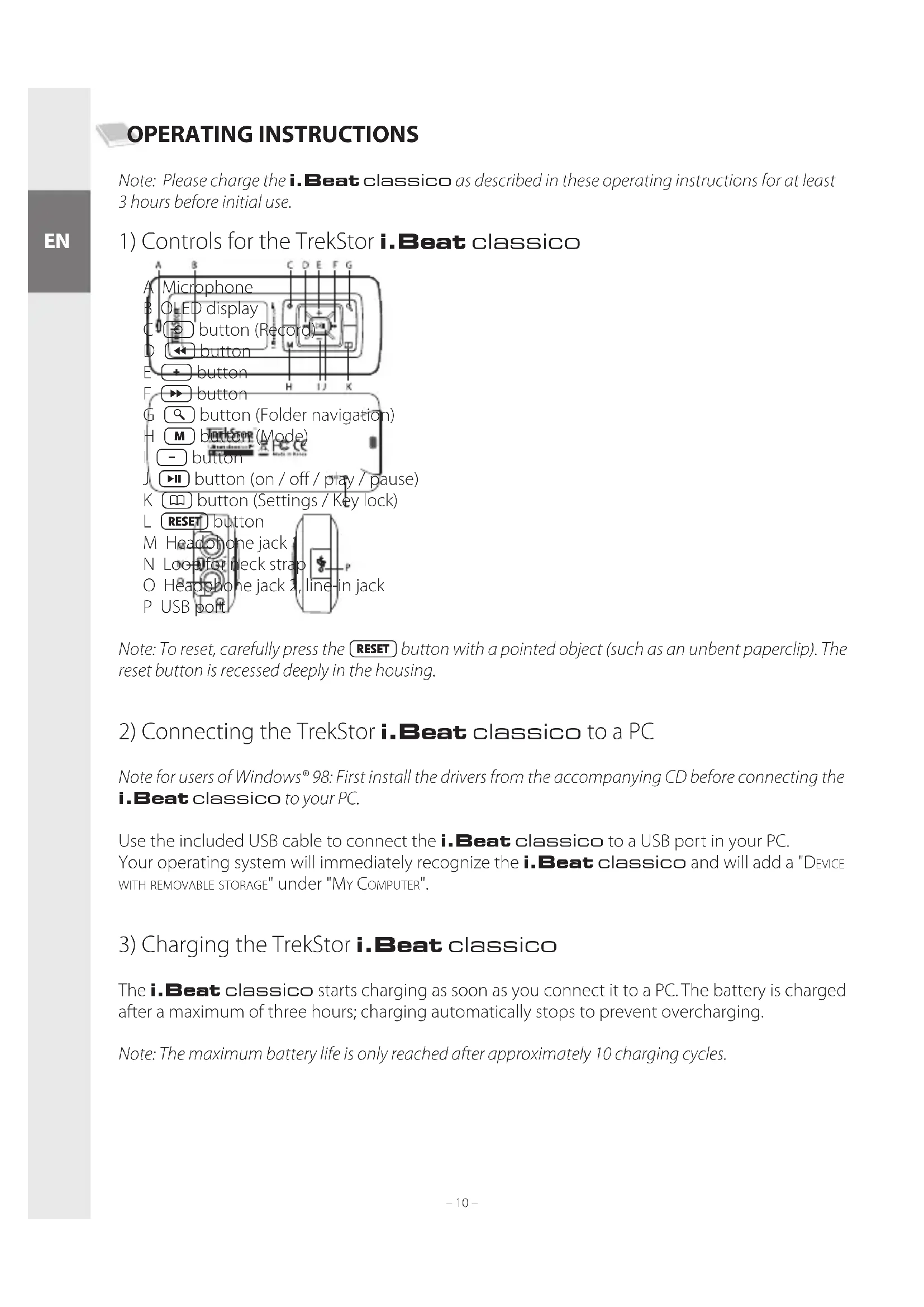 The i.Beat classico starts charging as soon as you connect it to a PC. The battery is charged after a maximum of three hours; charging automatically stops to prevent overcharging. Note: The maximum battery life is only reached after approximately 10 charging cycles. EN– 11 – – 11 –