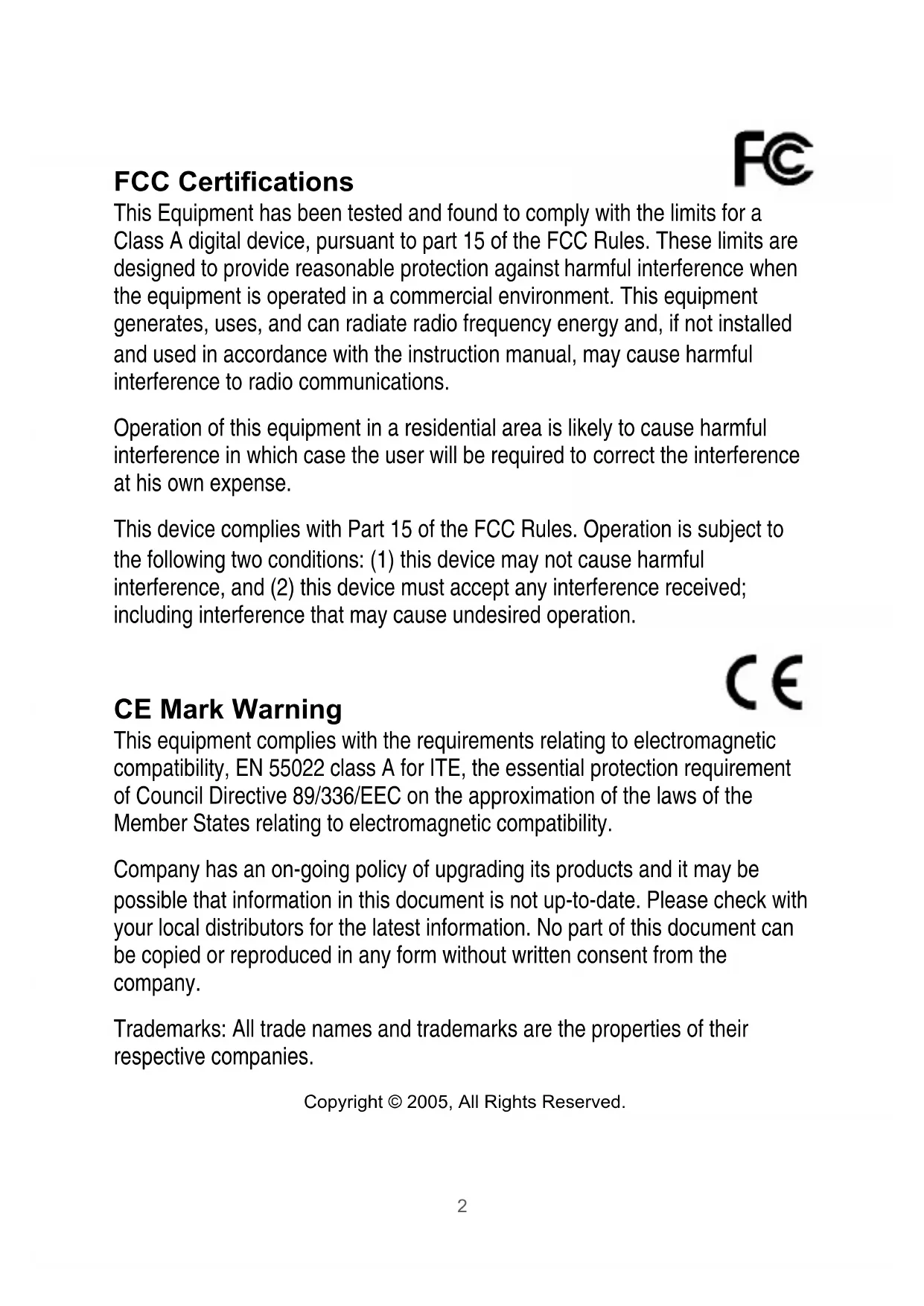 - Türkçe 1FCC Certifications This Equipment has been tested and found to comply with the limits for a Class A digital device, pursuant to part 15 of the FCC Rules. These limits are designed to provide reasonable protection against harmful interference when the equipment is operated in a commercial environment. This equipment generates, uses, and can radiate radio frequency energy and, if not installed and used in accordance with the instruction manual, may cause harmful interference to radio communications. Operation of this equipment in a residential area is likely to cause harmful interference in which case the user will be required to correct the interference at his own expense. This device complies with Part 15 of the FCC Rules. Operation is subject to the following two conditions: (1) this device may not cause harmful interference, and (2) this device must accept any interference received; including interference that may cause undesired operation. CE Mark Warning This equipment complies with the requirements relating to electromagnetic compatibility, EN 55022 class A for ITE, the essential protection requirement of Council Directive 89/336/EEC on the approximation of the laws of the Member States relating to electromagnetic compatibility. Company has an on-going policy of upgrading its products and it may be possible that information in this document is not up-to-date. Please check with your local distributors for the latest information. No part of this document can be copied or reproduced in any form without written consent from the company. Trademarks: All trade names and trademarks are the properties of their respective companies. Copyright © 2005, All Rights Reserved. 2English. Introduction This device is a powerful, high-performance Fast Ethernet switch, with all ports capable of 10 or 100Mbps auto-negotiation operation (NWay), which means this switch could automatically negotiate with the connected partners on the network speed and duplex mode. It is ideal for micro-segmenting large networks into smaller, connected subnets for improved performance, enabling the bandwidth demanding multimedia and imaging applications. Moreover, the 10/100Mbps auto-sensing ability provides an easy way to migrate 10Mbps to 100Mbps network with no pain. Compared to the shared 10Mbps or 100Mbps networks, the switch delivers a dedicated 10/100Mbps connection to every attached client with no bandwidth congestion issue. This switch also supports auto MDI / MDI-X function; each port could be used to connect to another switch or hub with no crossover RJ-45 cable. Store-and-forward switching mode promises the low latency plus eliminates all the network errors, including runt and CRC error packets. To work under full-duplex mode, transmission and reception of the frames can occur simultaneously without causing collisions as well as double the network bandwidth. The switch is plug-n-play without any software to configure and also fully compliant with all kinds of network protocols. Moreover, the rich diagnostic LEDs on the front-panel can provide the operating status of individual port and whole system. Before you start to install the switch, check the following contents in this package: p. 37