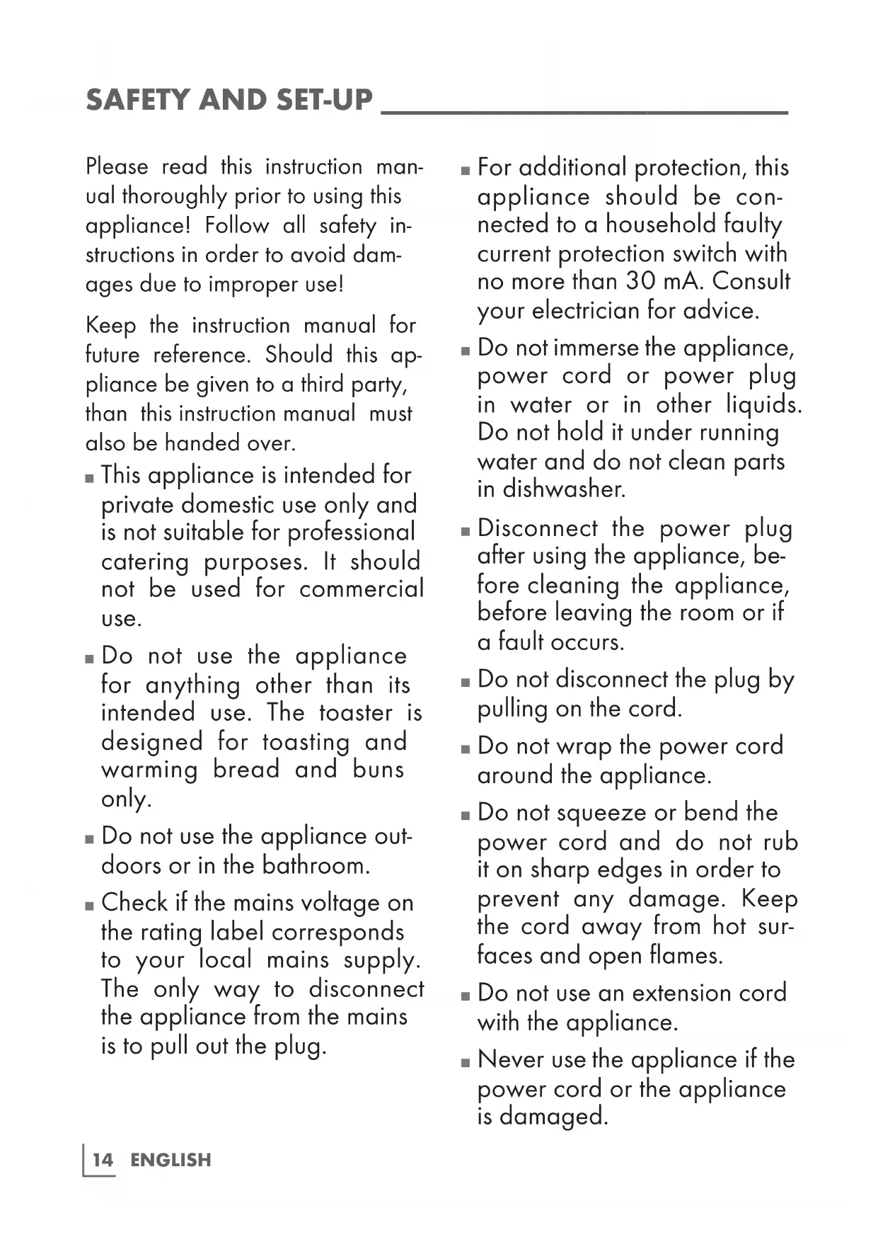 Do not use the appliance for anything other than its intended use. The toaster is designed for toasting and warming bread and buns only.