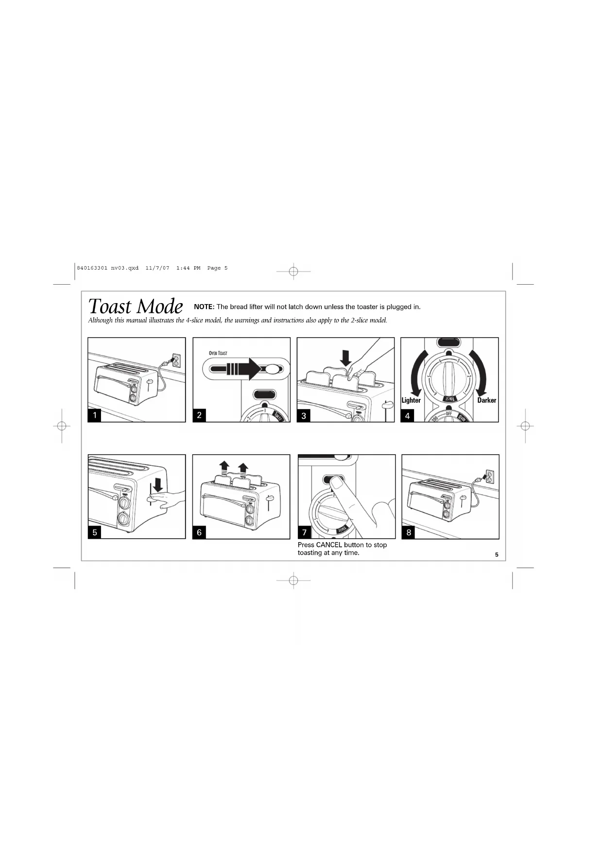 NOTE: The bread lifter will not latch down unless the toaster is plugged in.