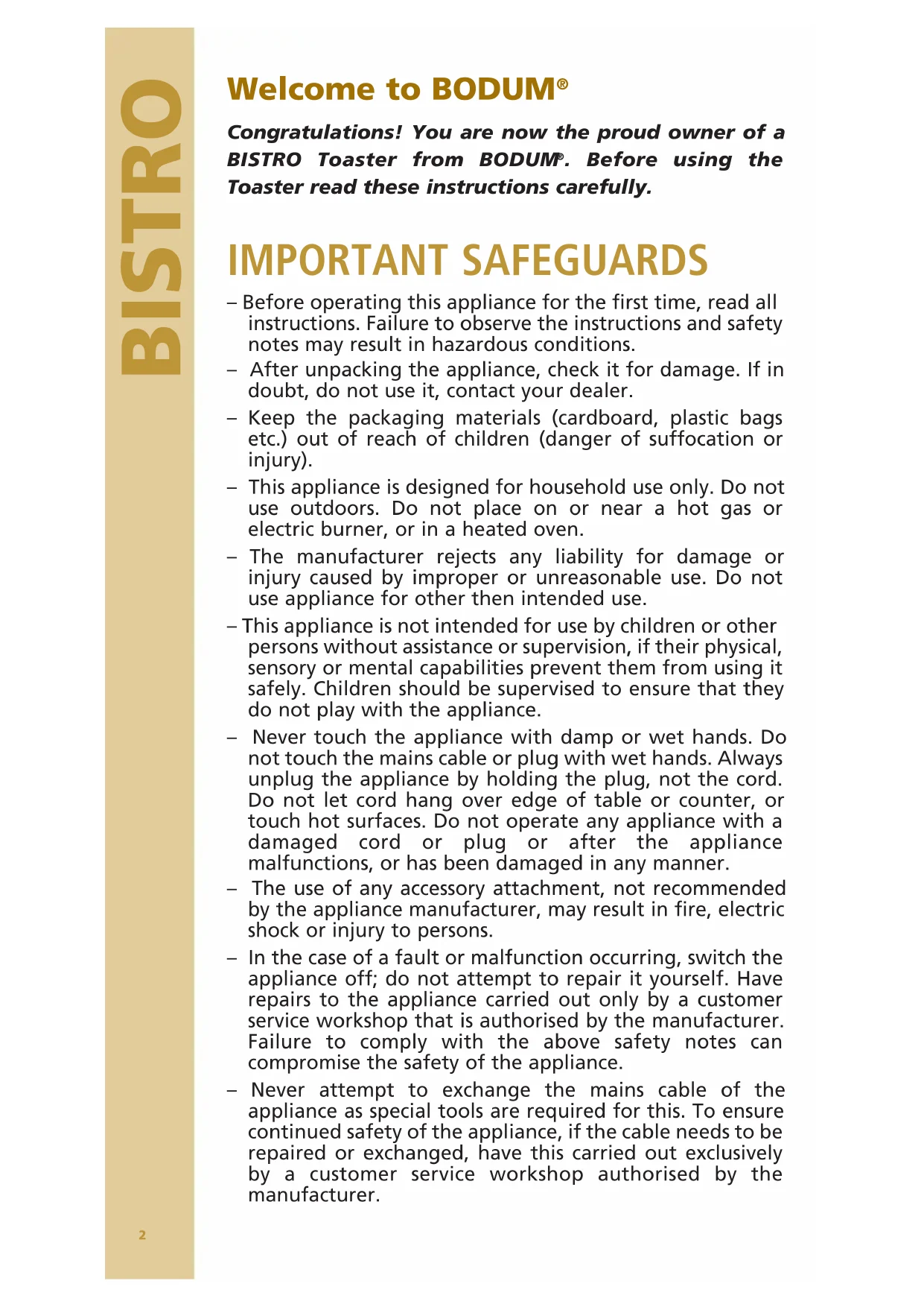 BISTRO 10709_Bistro_Toaster_Ifu.qxp 21.4.2008 16:03 Uhr Seite 2INSTRUCTION FOR USE – Unplug from outlet when not in use and before cleaning. Never immerse the item in water: Only clean the appliance using a damp cloth. Remember this is an electrical appliance. – To protect against fire, electric shock and injury to persons do not immerse cord or plugs in water or other liquid. – When the appliance is plugged into the electrical socket and whilst switched on never place hands into the bread toasting slots. – Do not insert foil-covered, oversized foods or utensils into the toaster as they may involve a risk of fire or electric shock. – Never insert sharp or abrasive objects into the slots, as this will cause damage. – The sides of the toaster and the areas surrounding the bread slots become very hot during use: operating the toaster should be carried out touching only the plastic button and handles. – Do not cover the appliance while it is in use. – Do not wrap the mains cord around the body of the toaster during or after use. The cord storage facility is located on the underside of the toaster. – A fire may occur if toasters are covered or touching flam- mable material, including curtains, draperies, wall, and the like, when in operation. – Do not attempt to dislodge food when toaster is plugged in. – The bread may burn, therefore do not use the toaster near or below combustible material, such as curtains. – The appliances are not intended to be operated by means of an external timer or separate remote-control system.
