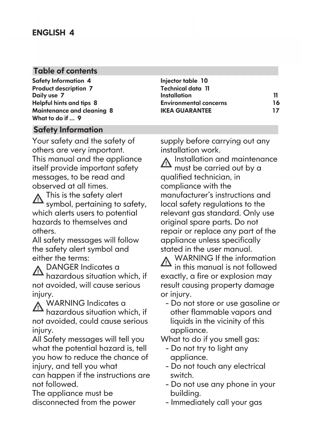 Language, Langue, Taal, Sprache Country, Pays, Land LandENGLISH 4 Your safety and the safety of others are very important. This manual and the appliance itself provide important safety messages, to be read and observed at all times. This is the safety alert symbol, pertaining to safety, which alerts users to potential hazards to themselves and others. All safety messages will follow the safety alert symbol and either the terms: DANGER Indicates a hazardous situation which, if not avoided, will cause serious injury. WARNING Indicates a hazardous situation which, if not avoided, could cause serious injury. All Safety messages will tell you what the potential hazard is, tell you how to reduce the chance of injury, and tell you what can happen if the instructions are not followed. The appliance must be disconnected from the power supply before carrying out any installation work. Installation and maintenance must be carried out by a qualied technician, in compliance with the manufacturer’s instructions and local safety regulations to the relevant gas standard. Only use original spare parts. Do not repair or replace any part of the appliance unless specically stated in the user manual. WARNING If the information in this manual is not followed exactly, a re or explosion may result causing property damage or injury. - Do not store or use gasoline or other ammable vapors and liquids in the vicinity of this appliance. What to do if you smell gas: - Do not try to light any appliance. - Do not touch any electrical switch. - Do not use any phone in your building. - Immediately call your gas Safety Information 4 Product description 7 Daily use 7 Helpful hints and tips 8 Maintenance and cleaning 8 What to do if ... 9 Injector table 10 Technical data 11 Installation 11 Environmental concerns 16 IKEA GUARANTEE 17 Safety Information Table of contentsENGLISH 5 supplier from a neighbor’s phone. Follow the gas supplier’s instructions. - If you cannot reach your gas supplier, call the re department. - Installation and service must be performed by a qualied installer, service agency or the gas supplier. - Use appliance in well ventilated rooms only. - The electrical and gas connections must comply with local regulations. - When the hob is installed, provide a multi-pole circuit breaker with a contact separation of at least 3 mm, that provides full disconnection. - Regulations require that the appliance is grounded. - The power cable must be long enough for connecting the appliance, once tted in its housing, to the power supply - Use only exible or rigid metal hose for gas connection. - If necessary, the electrical power cable must be replaced exclusively with a power cable having identical characteristics to the original supplied by manufacturer (type H05V2V2-F 90°C or H05RR-F). This operation must be performed by a qualied electrician. - The manufacturer cannot be held responsible for any injury to persons or animals or damage to property arising from failure to comply with these requirements. - Do not use multiple plug adapters or extension cords. - Do not pull the power cable to disconnect it from the electrical supply. - The electrical components must not be accessible to the user after installation. - Do not touch the appliance with any wet part of the body and do not operate it when barefoot. - This hob (class 3) is designed solely for private household use for cooking food. Do not use this appliance as a space heater to heat or warm the room. Doing so may result in carbon monoxide poisoning and overheating of the hob. - The Manufacturer declines all responsibility for inappropriate use or incorrect setting of the controls. - The appliance and its accessible parts become hot during use. Care should be taken to avoid touching heating elements. Children less than 8 years of age shall be kept away unless continuouslyENGLISH 6 supervised. This appliance can be used by children aged from 8 years and above and persons with reduced physical, sensory or mental capabilities or lack of experience and knowledge if they have been given supervision or instruction concerning use of the appliance in a safe way and understand the hazards involved. They shall not play with the appliance. - The use of a gas appliance produces heat and humidity in the room. Make sure the room is well-ventilated, or install an extractor hood with exhaust duct. - Domestic animals should be kept away from the appliance. - In case of prolonged use, additional ventilation may be necessary (by opening a window or increasing the hood extraction speed). - After use, make sure the knobs are in off position and close the main gas supply cock or the gas cylinder valve. - Overheated oils and fats catch re easily. Always remain vigilant when cooking foods rich in fat, oil or alcohol (e.g. rum, cognac, wine). - Unattended cooking on a hob with fat or oil can be dangerous and may result in re. NEVER try to extinguish a re with water, but switch off the appliance and then cover ame e.g. with a lid or a re blanket. Danger of re: do not store items on the cooking surfaces. - Keep the packaging materials out of the reach of children. - Before cleaning or maintenance wait for hob to cool down. - CAUTION: “In case of hotplate glass breakage: - shut immediately off all burners and any electrical heating element and isolate the appliance from the power supply - do not touch the appliance surface, - do not use the appliance”. - These instructions are valid only for those countries whose symbol is shown on the rating plate (under cooktop). - This product is not intended to be installed and operated outdoors. Save these instructionsENGLISH 7 Product description