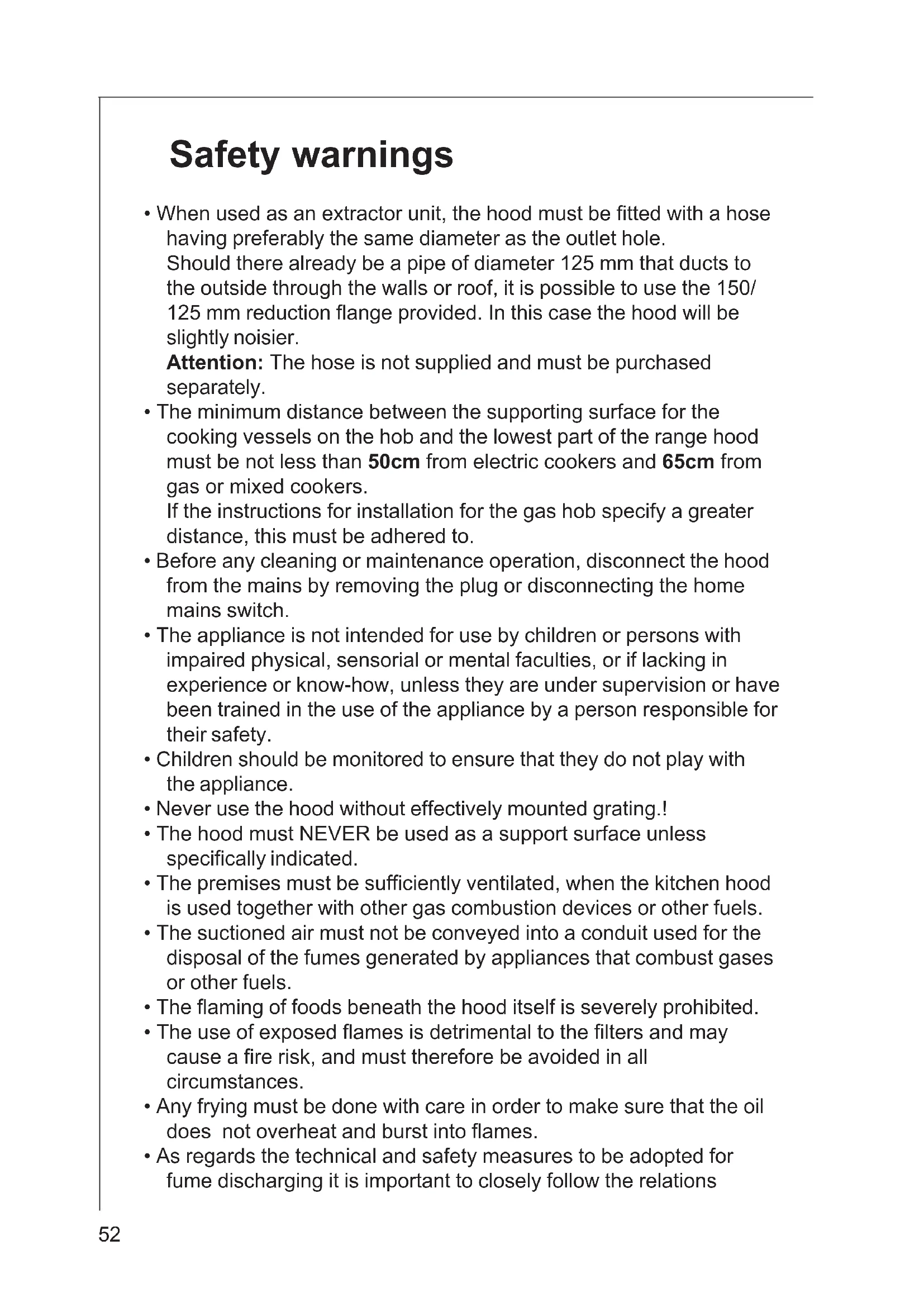 - The minimum distance between the supporting surface for the cooking vessels on the hob and the lowest part of the range hood must be not less than 50cm from electric cookers and 65cm from gas or mixed cookers.