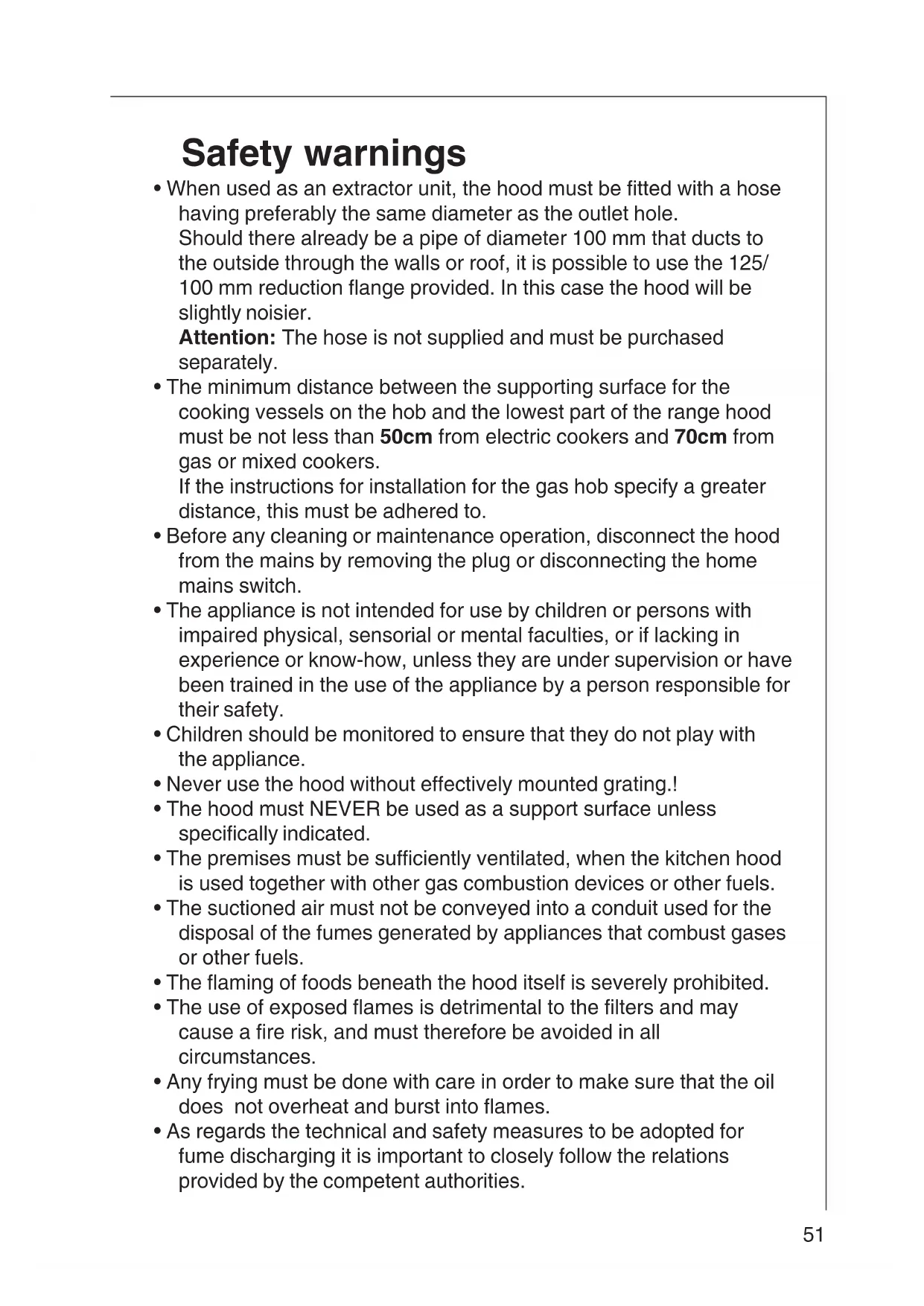 - The minimum distance between the supporting surface for the cooking vessels on the hob and the lowest part of the range hood must be not less than 50cm from electric cookers and 70cm from gas or mixed cookers.
