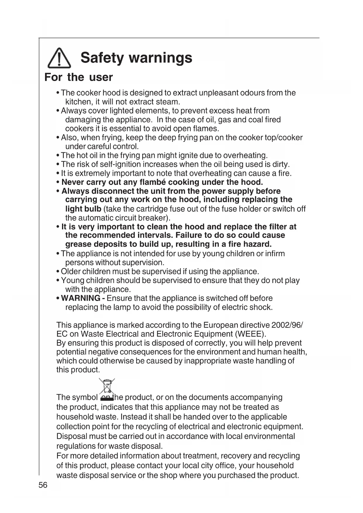 - WARNING - Ensure that the appliance is switched off before replacing the lamp to avoid the possibility of electric shock. This appliance is marked according to the European directive 2002/96/ EC on Waste Electrical and Electronic Equipment (WEEE). By ensuring this product is disposed of correctly, you will help prevent potential negative consequences for the environment and human health, which could otherwise be caused by inappropriate waste handling of this product. The symbol on the product, or on the documents accompanying the product, indicates that this appliance may not be treated as household waste. Instead it shall be handed over to the applicable collection point for the recycling of electrical and electronic equipment. Disposal must be carried out in accordance with local environmental regulations for waste disposal. For more detailed information about treatment, recovery and recycling of this product, please contact your local city office, your household waste disposal service or the shop where you purchased the product.57 For the installer