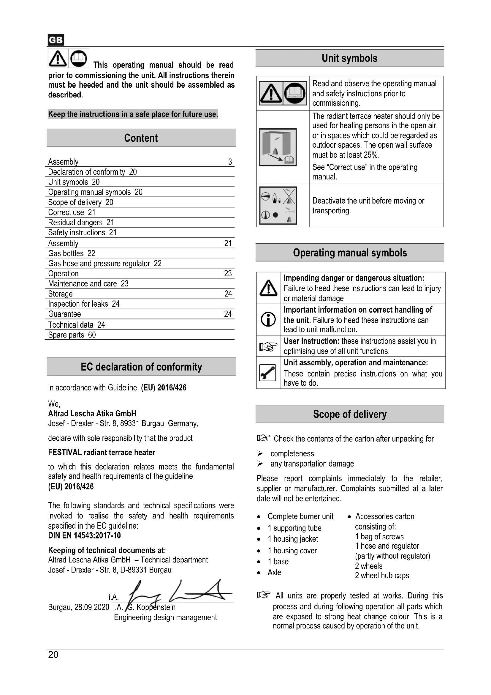 EC declaration of conformity in accordance with Guideline (EU) 2016/426 We, Altrad Lescha Atika GmbH Josef - Drexler - Str. 8, 89331 Burgau, Germany, declare with sole responsibility that the product FESTIVAL radiant terrace heater to which this declaration relates meets the fundamental safety and health requirements of the guideline (EU) 2016/426 The following standards and technical specifications were invoked to realise the safety and health requirements specified in the EC guideline: