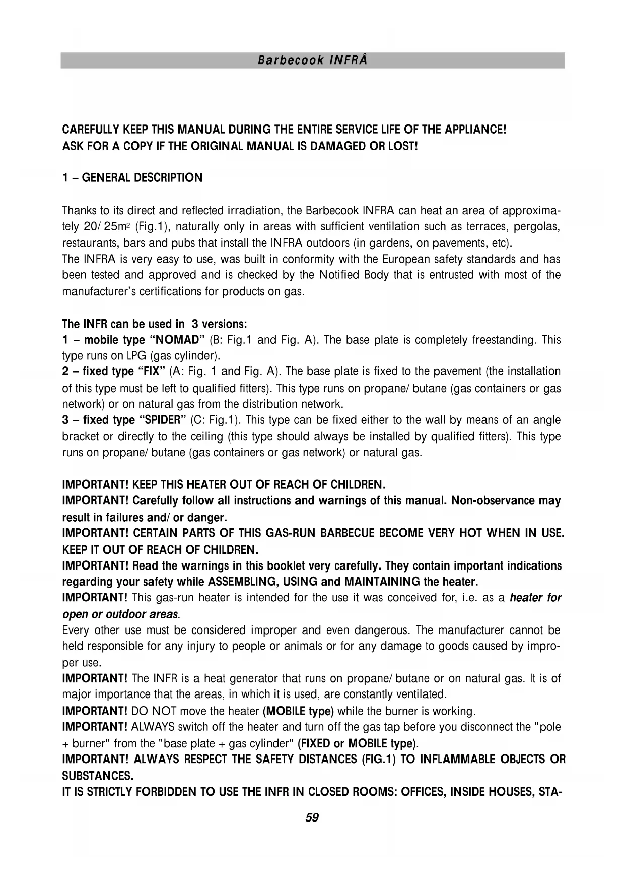 3 - fixed type "SPIDER" (C: Fig.1). This type can be fixed either to the wall by means of an angle bracket or directly to the ceiling (this type should always be installed by qualified fitters). This type runs on propane/ butane (gas containers or gas network) or natural gas.