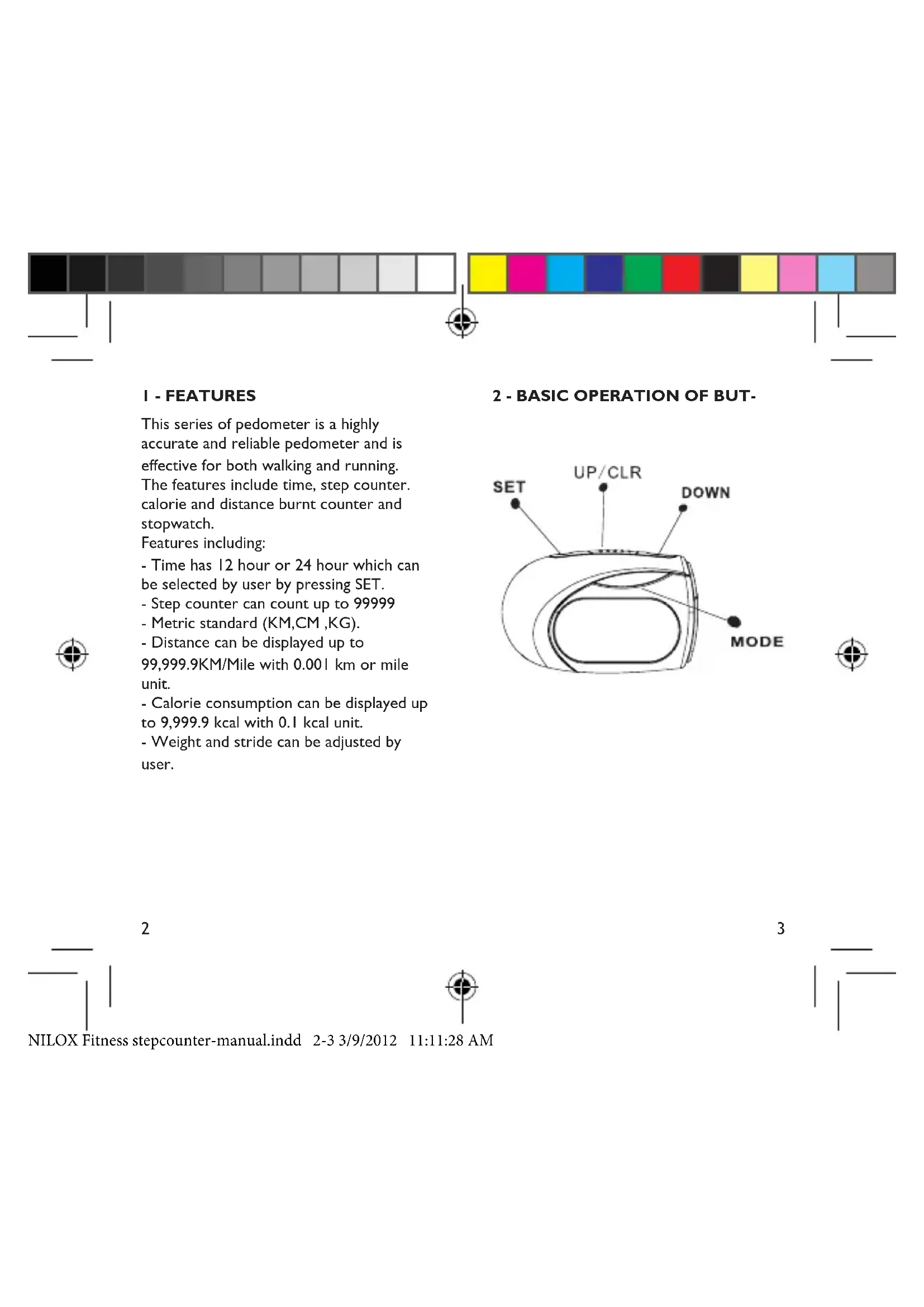 ETER -Your step counter clips easily and snugly to either side of the hip portion of your trousers or shorts. For best results keep the unit in line with the “Crease line” of your trousers. Some situations may affect the accuracy of the step counting: -The step counter is not direct perpendicular to the ground. -The pedometer needed to beat least 60 de- gree to the ground. -Dragging feet. -Walking with sandals or sandals likes shoes. - Uneven footstep in a crowed area. -Sport except walking or jogging, -Walking up/down from stair. -Inside a vehicle bicycle, motorcar, train, bus and other vehicle have some vibration generated. -Motion of stand or sit. NILOX Fitness stepcounter-manual.indd 6-7 3/9/2012 11:11:28 AM8 9