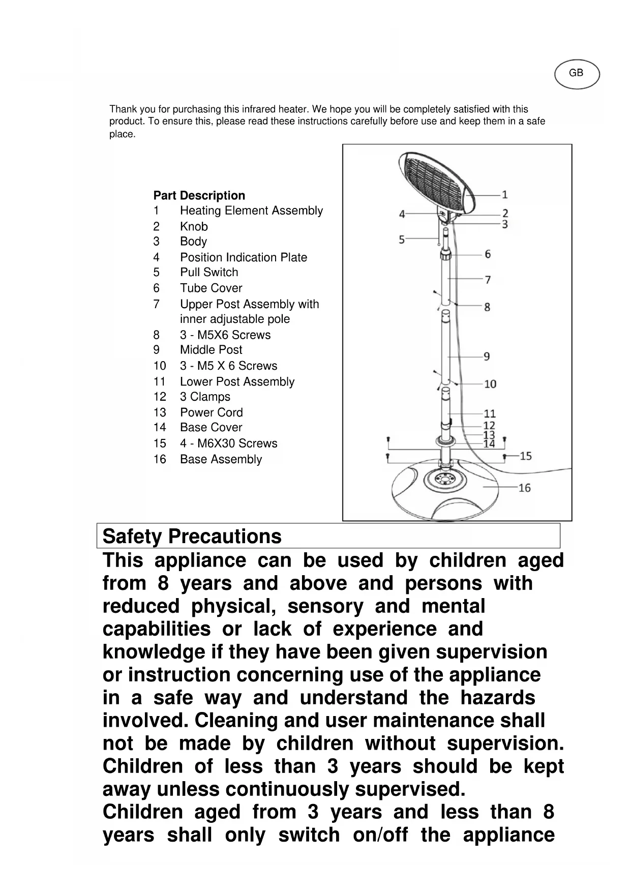 Do not use multiple sockets or extension cords.• Warning: In order to avoid overheating, do not cover the heater! Installation Before installing your appliance, you must disconnect the electrical supply at the circuit breaker. Insert the lower post assembly (11) into the base assembly (16) and then fix it tightly with the 4 M6X30 screws (15). Then insert the first clamp (12) into the lower post (11) (see fig.1). Join the Lower Post Assembly (11) and the Middle Post (9) together with 3 M5X6 screws (10) (see fig.2). Insert the second clamp to the Middle Post. Join the Upper Post Assembly (7) and the Middle Post (9) together with 3 M5X6 screws (8) (see fig.3). Insert the third smaller clamp to the Upper Post.