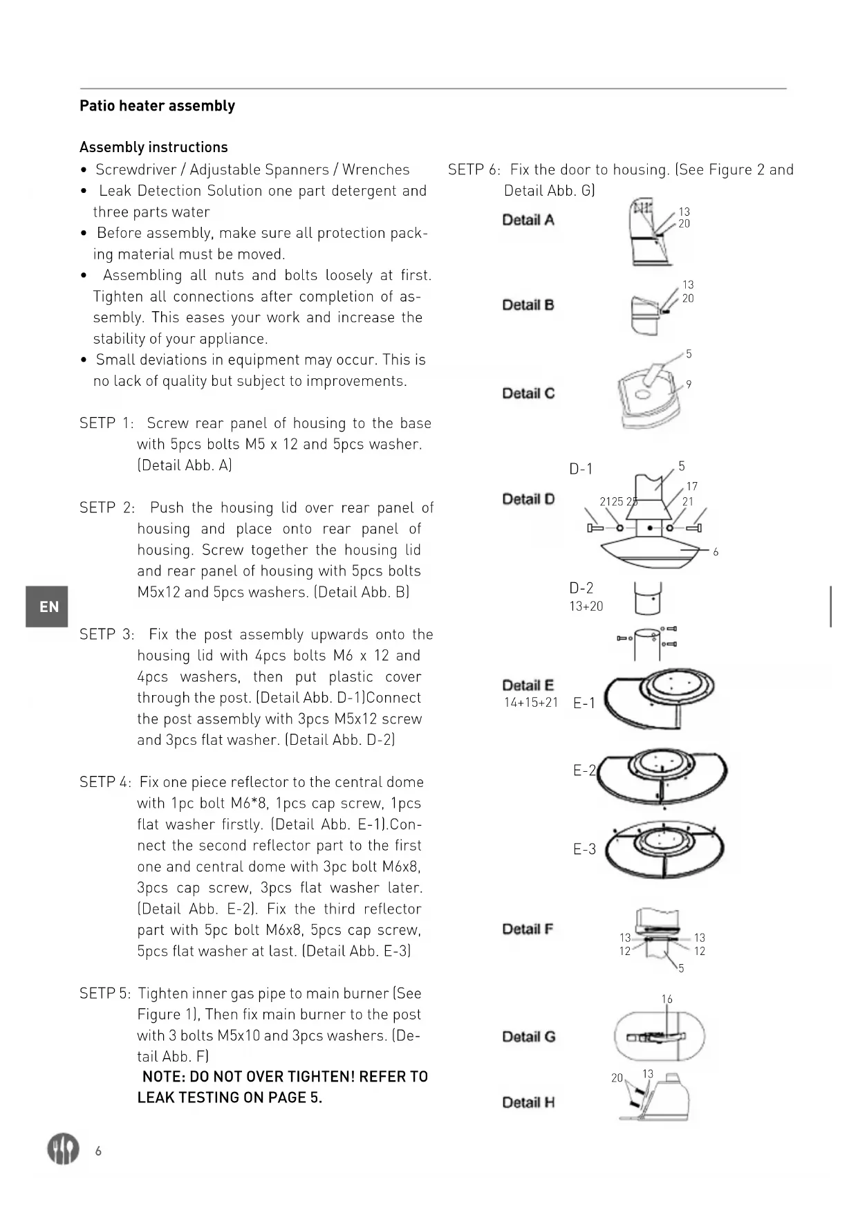 - Small deviations in equipment may occur. This is no lack of quality but subject to improvements. SETP 1: Screw rear panel of housing to the base with 5pcs bolts M5 x 12 and 5pcs washer. (Detail Abb. A) SETP 2: Push the housing lid over rear panel of housing and place onto rear panel of housing. Screw together the housing lid and rear panel of housing with 5pcs bolts M5x12 and 5pcs washers. (Detail Abb. B) SETP 3: Fix the post assembly upwards onto the housing lid with 4pcs bolts M6 x 12 and 4pcs washers, then put plastic cover through the post. (Detail Abb. D-1)Connect the post assembly with 3pcs M5x12 screw and 3pcs flat washer. (Detail Abb. D-2) SETP 4: Fix one piece reflector to the central dome with 1pc bolt M6*8, 1pcs cap screw, 1pcs flat washer firstly. (Detail Abb. E-1).Con- nect the second reflector part to the first one and central dome with 3pc bolt M6x8, 3pcs cap screw, 3pcs flat washer later. (Detail Abb. E-2). Fix the third reflector part with 5pc bolt M6x8, 5pcs cap screw, 5pcs flat washer at last. (Detail Abb. E-3) SETP 5: Tighten inner gas pipe to main burner (See Figure 1), Then fix main burner to the post with 3 bolts M5x10 and 3pcs washers. (De- tail Abb. F) NOTE: DO NOT OVER TIGHTEN! REFER TO LEAK TESTING ON PAGE 5. SETP 6: Fix the door to housing. (See Figure 2 and Detail Abb. G)