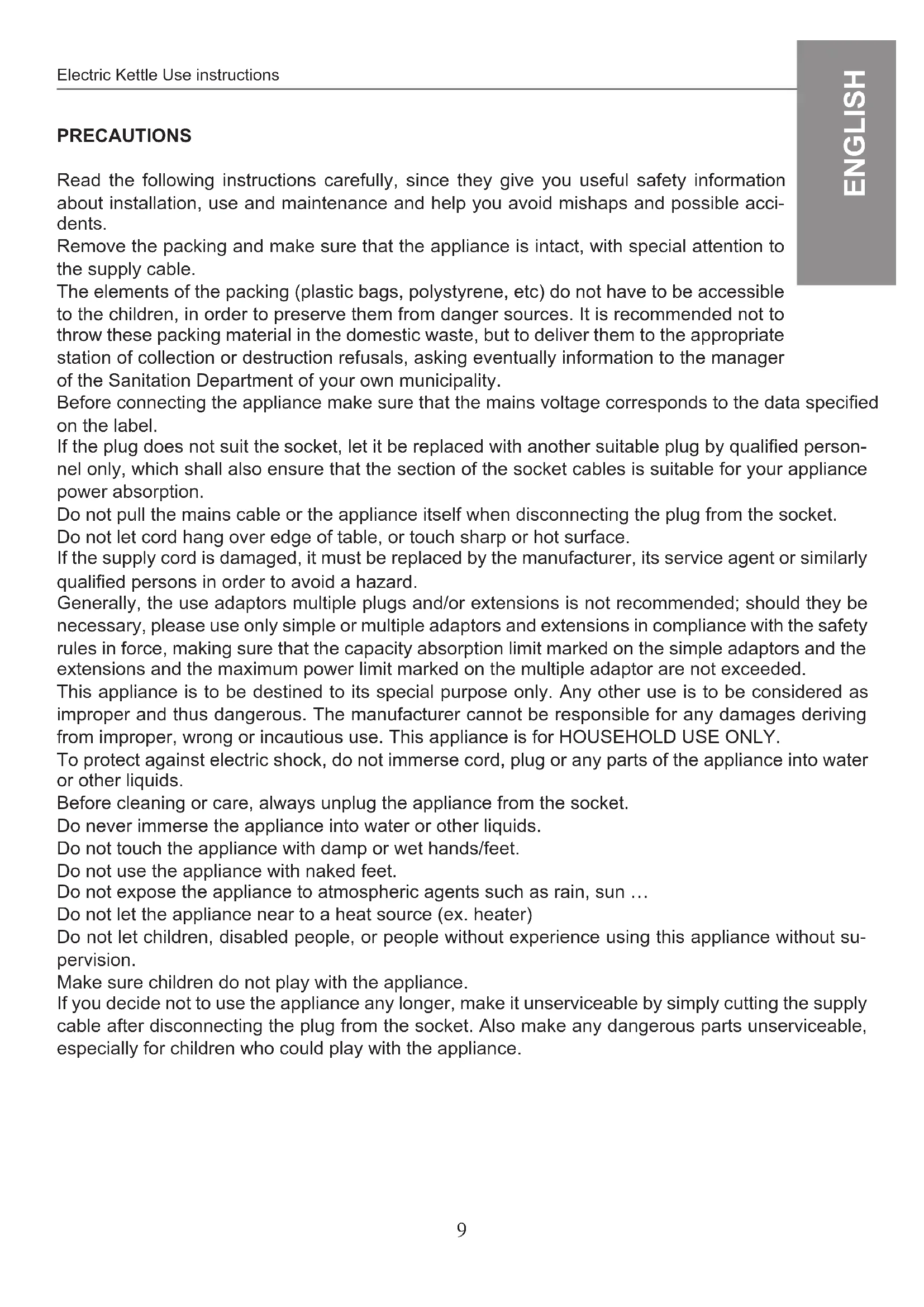 This appliance is to be destined to its special purpose only. Any other use is to be considered as improper and thus dangerous. The manufacturer cannot be responsible for any damages deriving from improper, wrong or incautious use. This appliance is for HOUSEHOLD USE ONLY.