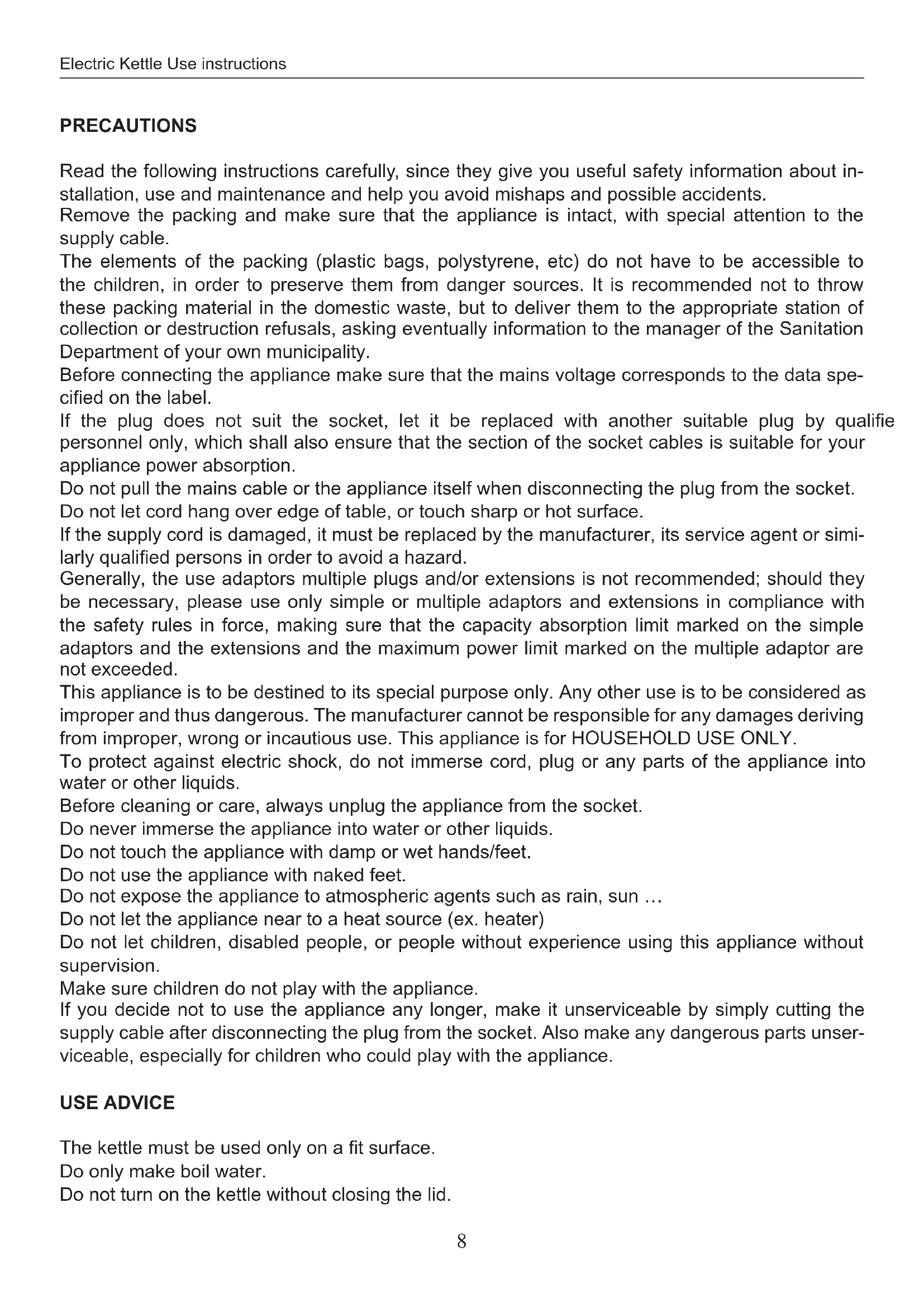 This appliance is to be destined to its special purpose only. Any other use is to be considered as improper and thus dangerous. The manufacturer cannot be responsible for any damages deriving from improper, wrong or incautious use. This appliance is for HOUSEHOLD USE ONLY.