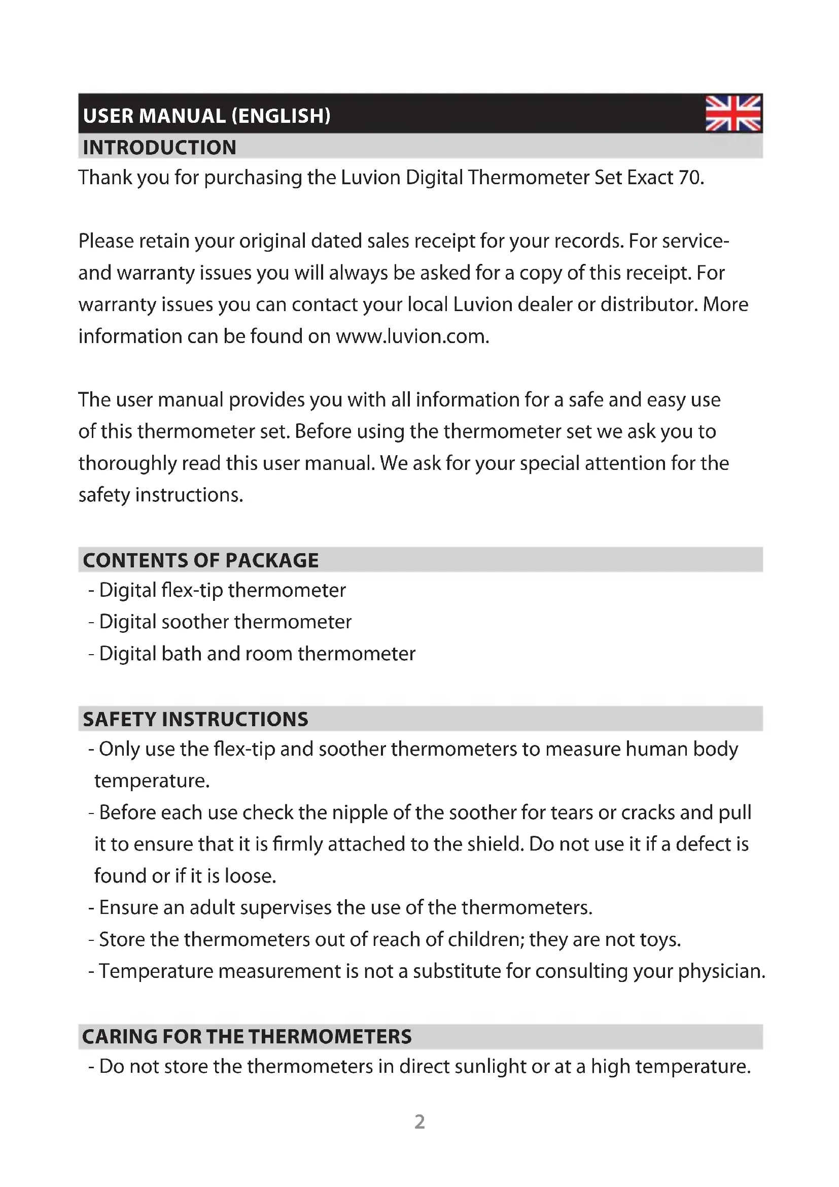 USER MANUAL (ENGLISH) INTRODUCTION Thank you for purchasing the Luvion Digital Thermometer Set Exact 70. Please retain your original dated sales receipt for your records. For service- and warranty issues you will always be asked for a copy of this receipt. For warranty issues you can contact your local Luvion dealer or distributor. More information can be found on www.luvion.com. The user manual provides you with all information for a safe and easy use of this thermometer set. Before using the thermometer set we ask you to thoroughly read this user manual. We ask for your special attention for the safety instructions.