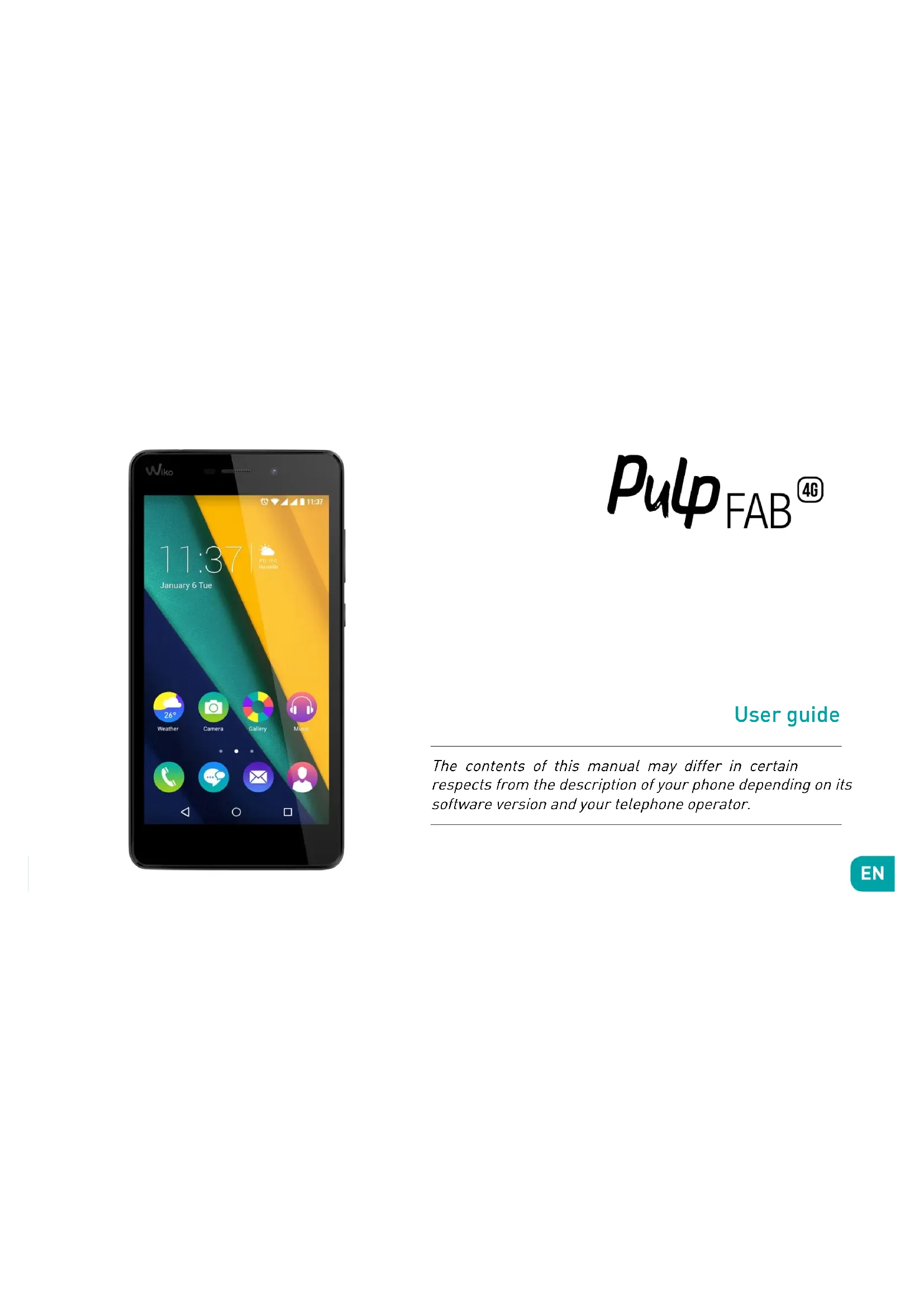 wikomobile.com User guide Guide d’utilisateur Manuale d’uso Guía de usuario Guia de utilização Bedienungsanleitung Gebruikershandleiding Instrukcja obsługiUser guide The contents of this manual may differ in certain respects from the description of your phone depending on its software version and your telephone operator.CONGRATULATIONS ! You have just purchased your WIKO PULP FAB 4G mobile phone. This guide contains all the information needed to use the phone so that you can quickly fa- miliarise yourself, we hope, with the world of WIKO. Copyright © 2015 WIKO The information contained in this manual may not be disclosed to third parties or reproduced in any form whatsoever without the express written consent of WIKO. Trademarks WIKO is a registered trademark of WIKO SAS. Disclaimer This manual has been prepared with the utmost care and attention and is designed to guide you through the functions and features of your device. However, the information and recommendations contained herein do not constitute a guarantee under the Applicable law. WIKO reserves the right to change or modify the information contained in this manual at any time. Limitation of Liability All content and services accessible through this device are the exclusive property of third parties and are protected by the relevant laws (copyright, patent, licence and/or other intellectual property laws). These services are for your own personal non- commercial use. It is not permitted to use any content or services without prior written permission of the content owner. You may not copy, publish, transfer, sell, create derivative works or exploit in any manner or medium any content or services displayed through this device.THIRD PARTY CONTENT AND SERVICES ARE PROVIDED “AS IS.” WIKO DOES NOT GUARANTEE THE CONTENT OR SERVICES SO PROVIDED, EITHER