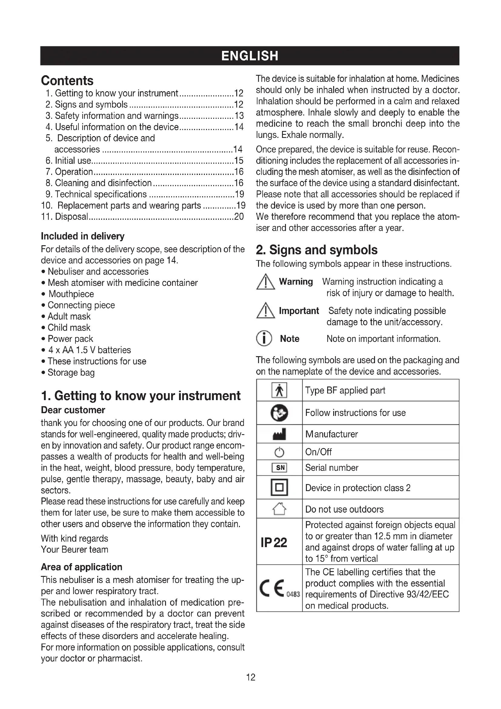 Dear customer thank you for choosing one of our products. Our brand stands for well-engineered, quality made products; driv- en by innovation and safety. Our product range encom- passes a wealth of products for health and well-being in the heat, weight, blood pressure, body temperature, pulse, gentle therapy, massage, beauty, baby and air sectors. Please read these instructions for use carefully and keep them for later use, be sure to make them accessible to other users and observe the information they contain. With kind regards Your Beurer team Area of application This nebuliser is a mesh atomiser for treating the up- per and lower respiratory tract. The nebulisation and inhalation of medication pre- scribed or recommended by a doctor can prevent against diseases of the respiratory tract, treat the side effects of these disorders and accelerate healing. For more information on possible applications, consult your doctor or pharmacist. The device is suitable for inhalation at home. Medicines should only be inhaled when instructed by a doctor. Inhalation should be performed in a calm and relaxed atmosphere. Inhale slowly and deeply to enable the medicine to reach the small bronchi deep into the lungs. Exhale normally. Once prepared, the device is suitable for reuse. Recon- ditioning includes the replacement of all accessories in- cluding the mesh atomiser, as well as the disinfection of the surface of the device using a standard disinfectant. Please note that all accessories should be replaced if the device is used by more than one person. We therefore recommend that you replace the atom