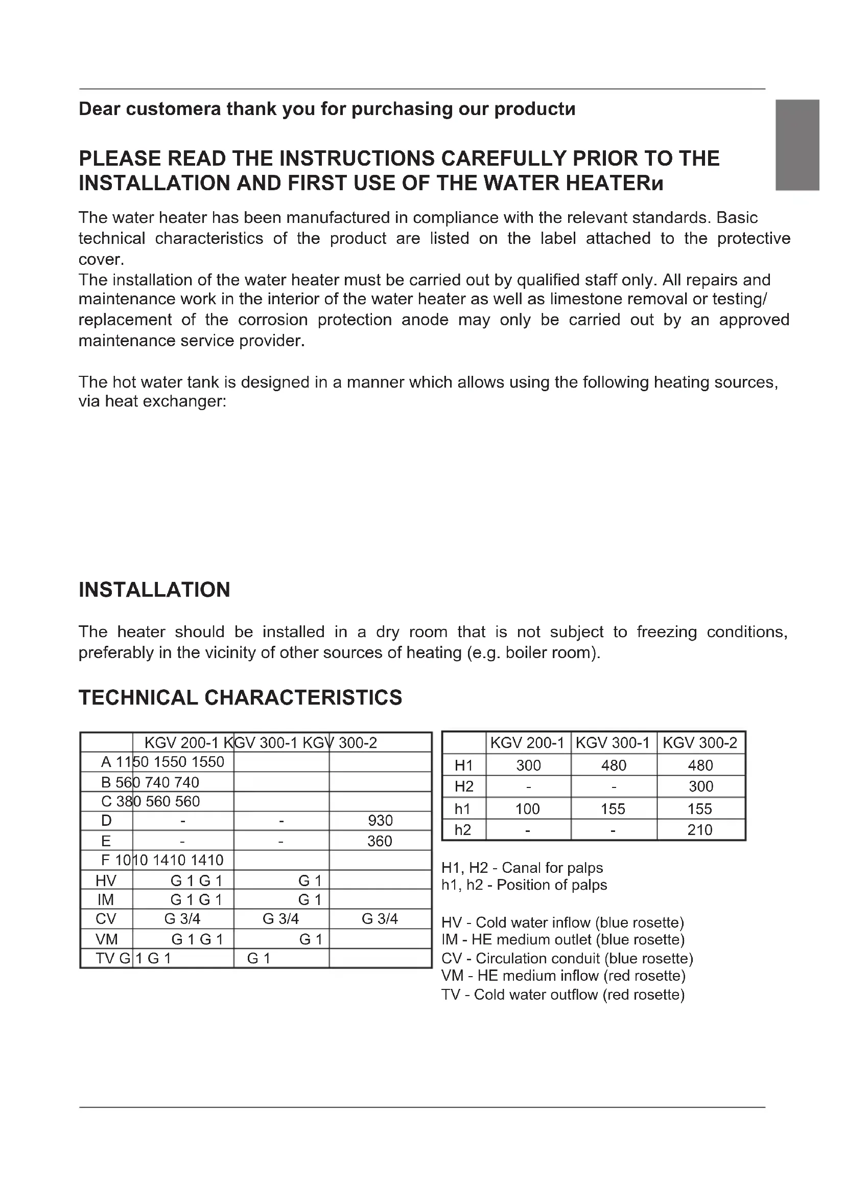 The water heater is ready for use once it has been connected to water and other sources of heating. The usual main sources of heating of water for sanitary use are central heating or solar power; in this case any regulation of water heating is performed in the heating system. lêêêyêêêêêêêêf¡¨ª±êêêêê zoêêêêênꦽ¤±êêêêêêêê® - If you need higher temperature of water than assured by other heating sources, - If due to seasonal or other conditions there are no main heating sources. In case of exposure to sub-zero temperatures, the water should be thoroughly drained from the heater before the onset of freezing conditions. Once that is done, open the hot water tap on one of the mixer taps connected to the water heater. The water from the water heater drains by way of the drain valve on the inlet pipe. External parts of the water heater may be cleaned with a mild detergent solution. Do not use solvents and abrasive cleaners. Regular preventive maintenance inspections ensure faultless performance and long life of your heater. The first of these inspections should be carried out by an authorised maintenance service provider about two years from the date of installation in order to inspect the wear of the corrosion protection anode and to remove any limestone as required. Build-up of limestone is a product of quality, quantity and temperature of water flowing through the water heater. While inspecting the heater, the maintenance service provider will also recommend the date of the next inspection. Wear of the corrosion protection anode is carried out visually. Replacement is required when the inspection reveals that the anode diameter has been substantially reduced or worn all the way to the steel core. Tank warranty is subject to regular inspections of the protective anode. In the event of the water heater breaking down, you are kindly requested to contact the authorised maintenance service provider located closest to you. Please do not attempt to repair the unit yourself. ni£¤ Cijenjeni kupci, zahvaljujemo vam što ste kupili naš proizvod. MOLIMO DA PRIJE UGRADNJE I PRVE UPORABE SPREMNIKA TOPLE VODE PAŽLJIVO PROČITATE UPUTE. Spremnik tople vode izrađen je u skladu s važećim normama. Njegove osnovne tehničke osobine navedene su na učinskoj pločici koja je nalijepljena na zaštitni pokrov. Spremnik tople vode smije priključiti samo za to osposobljeni stručnjak. Zahvate u njegovoj unutrašnjosti zbog popravka, uklanjanja kamenca te provjere ili zamjene antikorozijske zaštitne anode smije izvoditi samo ovlašteni serviser. Spremnik tople vode napravljen je tako da se preko prijenosnika topline mogu koristiti slijedeći izvori topline i to: - kotao centralnog grijanja - sunčnu energiju - toplinsku crpku uêêêê9êêêê:ê:êêyêêêf¡¨ªêê ê:ê:êêzoêê:êênꦽ¤ UGRADNJA Spremnik tople vode postavite u suhi prostor, gdje se ne smrzava, po mogućnosti u blizini drugih izvora grijanja (npr. u ložionici / kotlovnici).