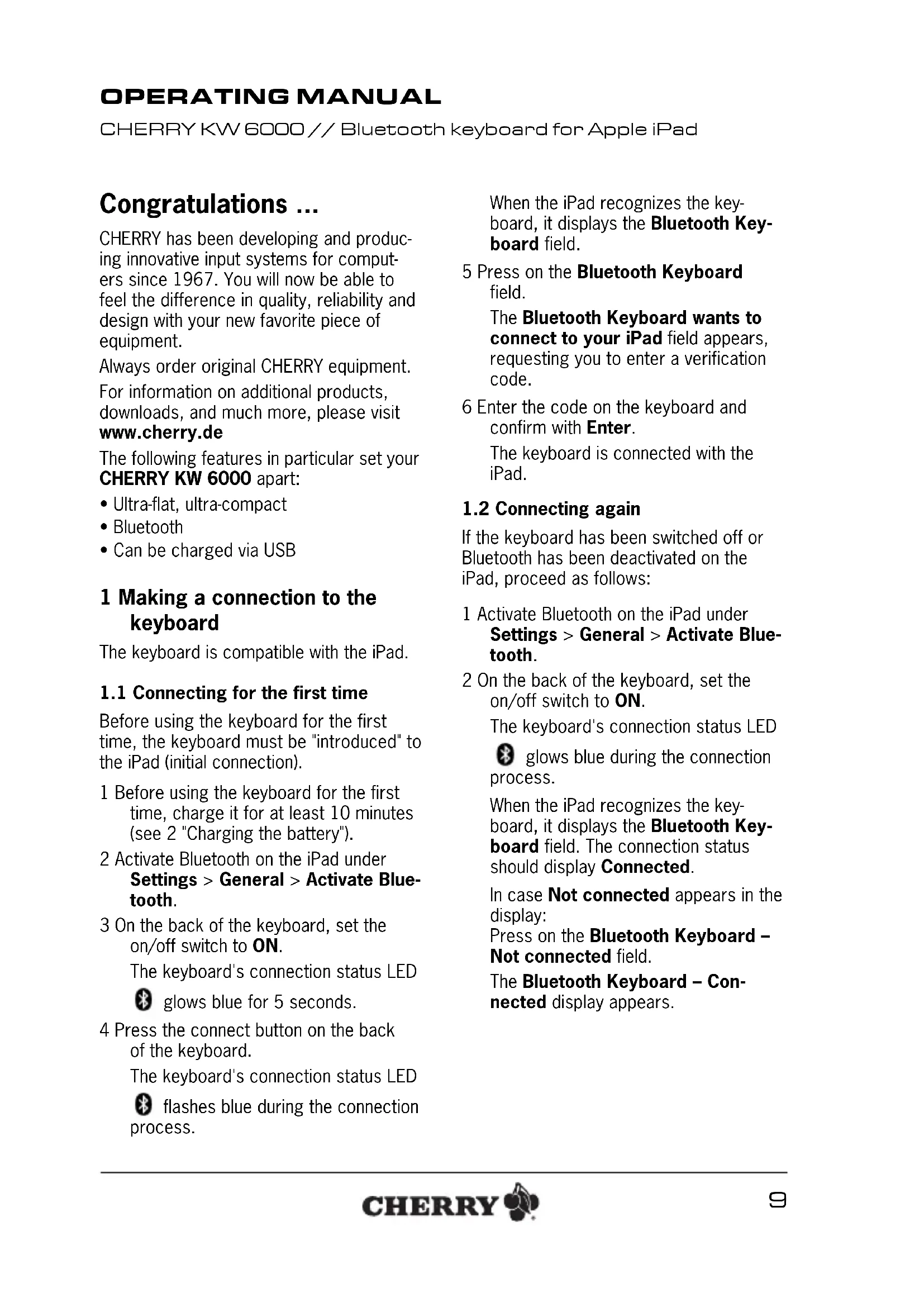 If the keyboard has been switched off or Bluetooth has been deactivated on the iPad, proceed as follows: 1 Activate Bluetooth on the iPad under Settings > General > Activate Blue- tooth. 2 On the back of the keyboard, set the on/off switch to ON. The keyboard's connection status LED glows blue during the connection process. When the iPad recognizes the key- board, it displays the Bluetooth Key- board field. The connection status should display Connected. In case Not connected appears in the display: Press on the Bluetooth Keyboard – Not connected field. The Bluetooth Keyboard – Con- nected display appears. OPERATING MANUAL CHERRY KW 6000 // Bluetooth keyboard for Apple iPad10 2 Charging the battery The keyboard contains a lithium ion poly- mer battery which needs to be charged after several weeks of use. As the battery has no memory effect, you can recharge it at any time. You can continue working while it is charg- ing. The keyboard is switched on when the charging cable is connected and also if the switch is in the OFF position. Charge the keyboard when the battery status LED flashes red at intervals of 5seconds. 1 On the back of the keyboard, set the on/off switch to ON. 2 Connect the mini USB cable with the socket on the back of the keyboard and to a USB connection or a USB net- work adapter