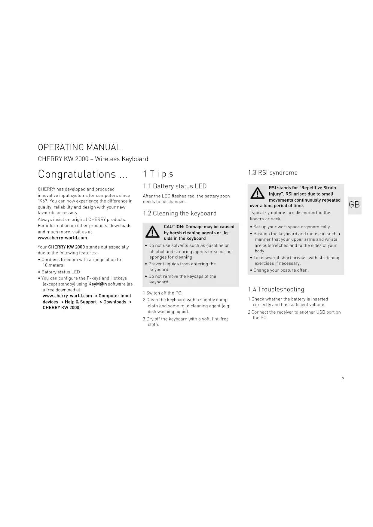 - Keep the device out of the reach of children under 6 years. OPERATING MANUAL CHERRY KW 2000 – Wireless Keyboard GB9 8 Certifications