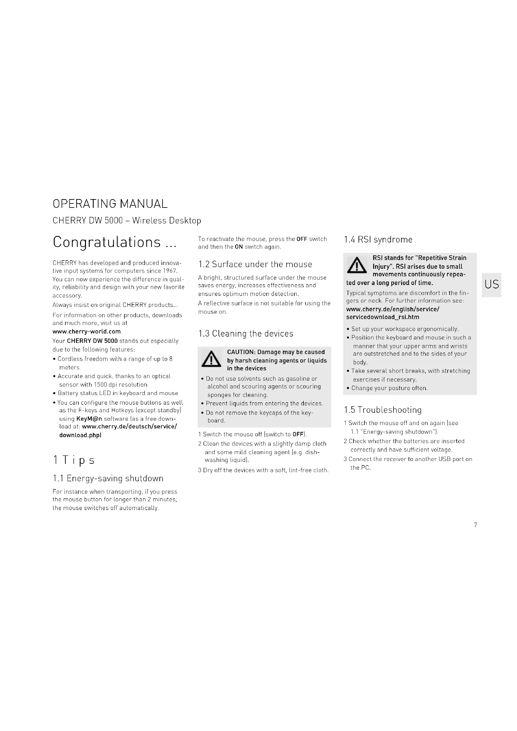 2 Check whether the batteries are inserted correctly and have sufficient voltage. 3 Connect the receiver to another USB port on the PC. RSI stands for "Repetitive Strain Injury". RSI arises due to small movements continuously repea- ted over a long period of time. Typical symptoms are discomfort in the fin- gers or neck. For further information see: www.cherry.de/english/service/ servicedownload_rsi.htm