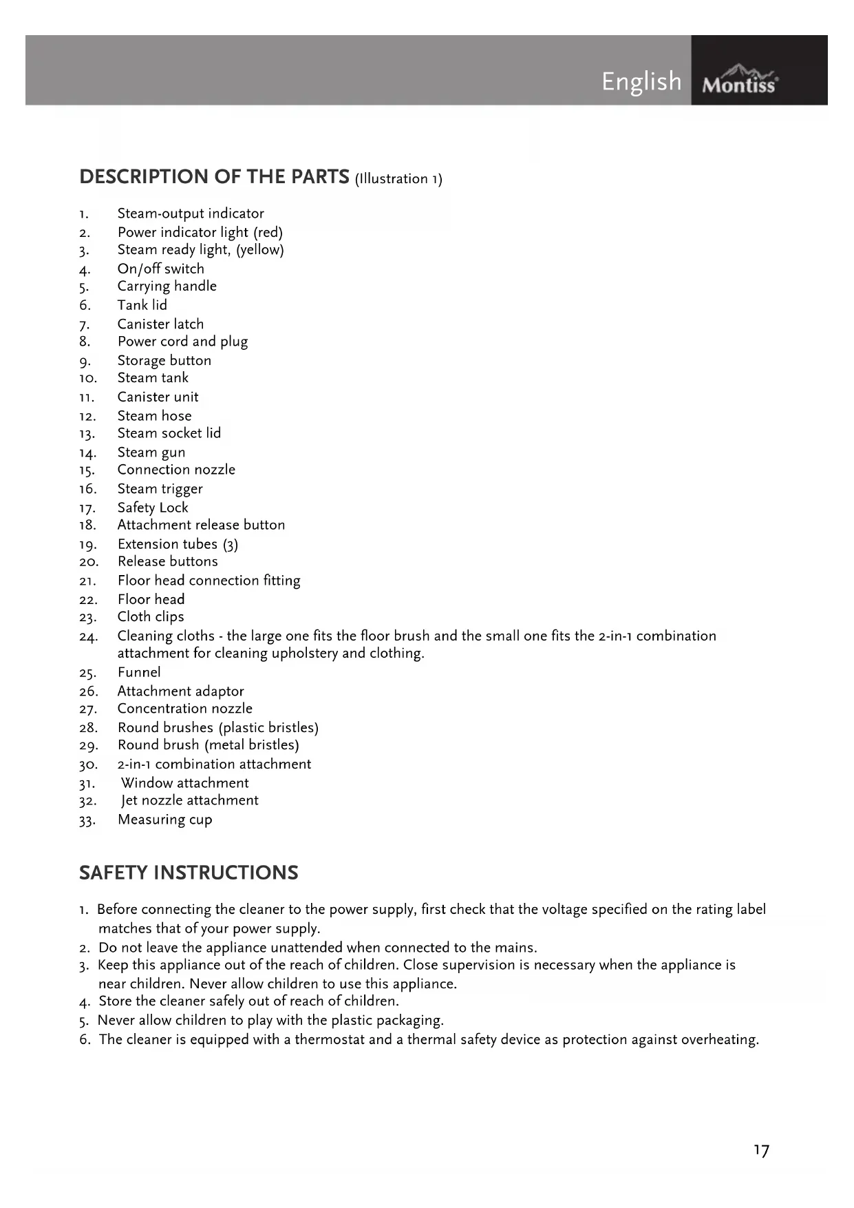 Steam-output indicator Power indicator light (red) Steam ready light, (yellow) On/off switch Carrying handle Tank lid Canister latch Power cord and plug Storage button Steam tank Canister unit Steam hose Steam socket lid Steam gun Connection nozzle Steam trigger Safety Lock Attachment release button Extension tubes (3) Release buttons Floor head connection fitting Floor head Cloth clips Cleaning cloths - the large one fits the floor brush and the small one fits the 2-in-1 combination attachment for cleaning upholstery and clothing. Funnel Attachment adaptor Concentration nozzle Round brushes (plastic bristles) Round brush (metal bristles) 2-in-1 combination attachment Window attachment Jet nozzle attachment Measuring cup SAFETY INSTRUCTIONS English