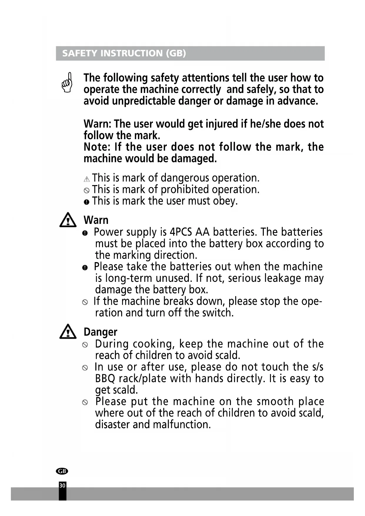 The following safety attentions tell the user how to operate the machine correctly and safely, so that to avoid unpredictable danger or damage in advance. Warn: The user would get injured if he/she does not follow the mark. Note: If the user does not follow the mark, the machine would be damaged. This is mark of dangerous operation. This is mark of prohibited operation. This is mark the user must obey. Warn Power supply is 4PCS AA batteries. The batteries must be placed into the battery box according to the marking direction. Please take the batteries out when the machine is long-term unused. If not, serious leakage may damage the battery box. If the machine breaks down, please stop the ope- ration and turn off the switch. Danger During cooking, keep the machine out of the reach of children to avoid scald. In use or after use, please do not touch the s/s BBQ rack/plate with hands directly. It is easy to get scald. Please put the machine on the smooth place where out of the reach of children to avoid scald, disaster and malfunction.