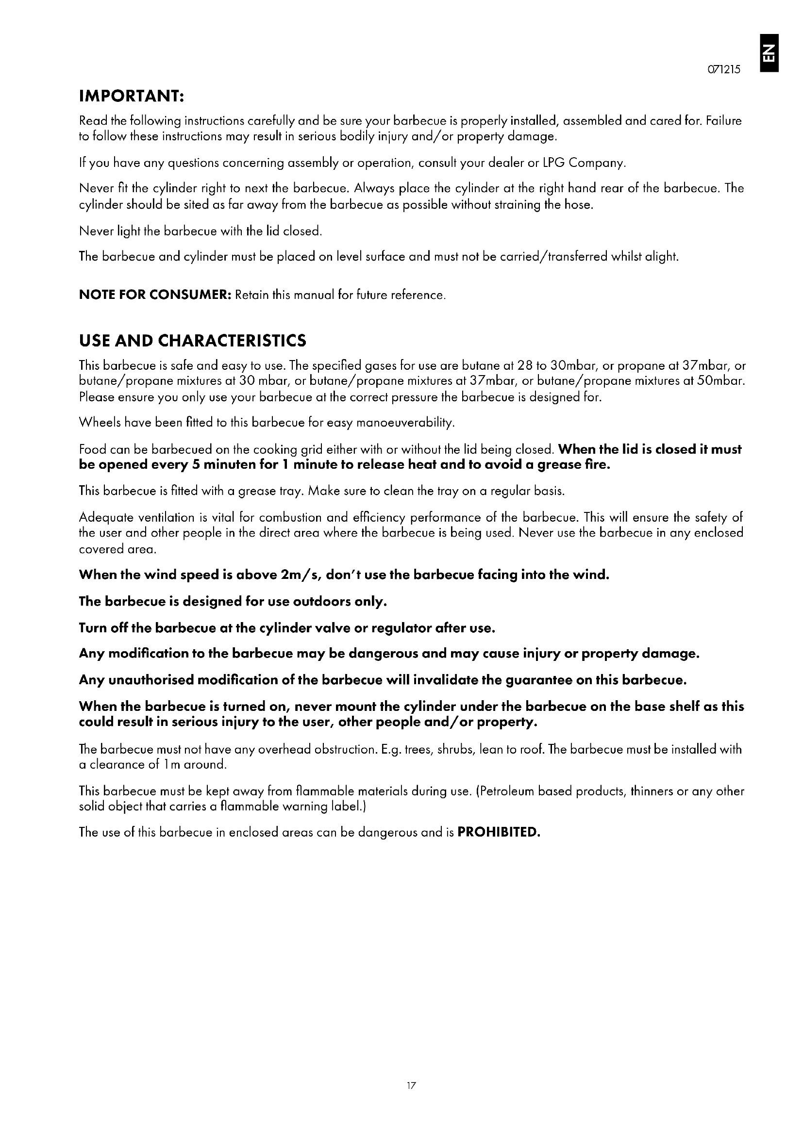 IMPORTANT: Read the following instructions carefully and be sure your barbecue is properly installed, assembled and cared for. Failure to follow these instructions may result in serious bodily injury and/or property damage. If you have any questions concerning assembly or operation, consult your dealer or LPG Company. Never fit the cylinder right to next the barbecue. Always place the cylinder at the right hand rear of the barbecue. The cylinder should be sited as far away from the barbecue as possible without straining the hose. Never light the barbecue with the lid closed. The barbecue and cylinder must be placed on level surface and must not be carried/transferred whilst alight. NOTE FOR CONSUMER: Retain this manual for future reference.