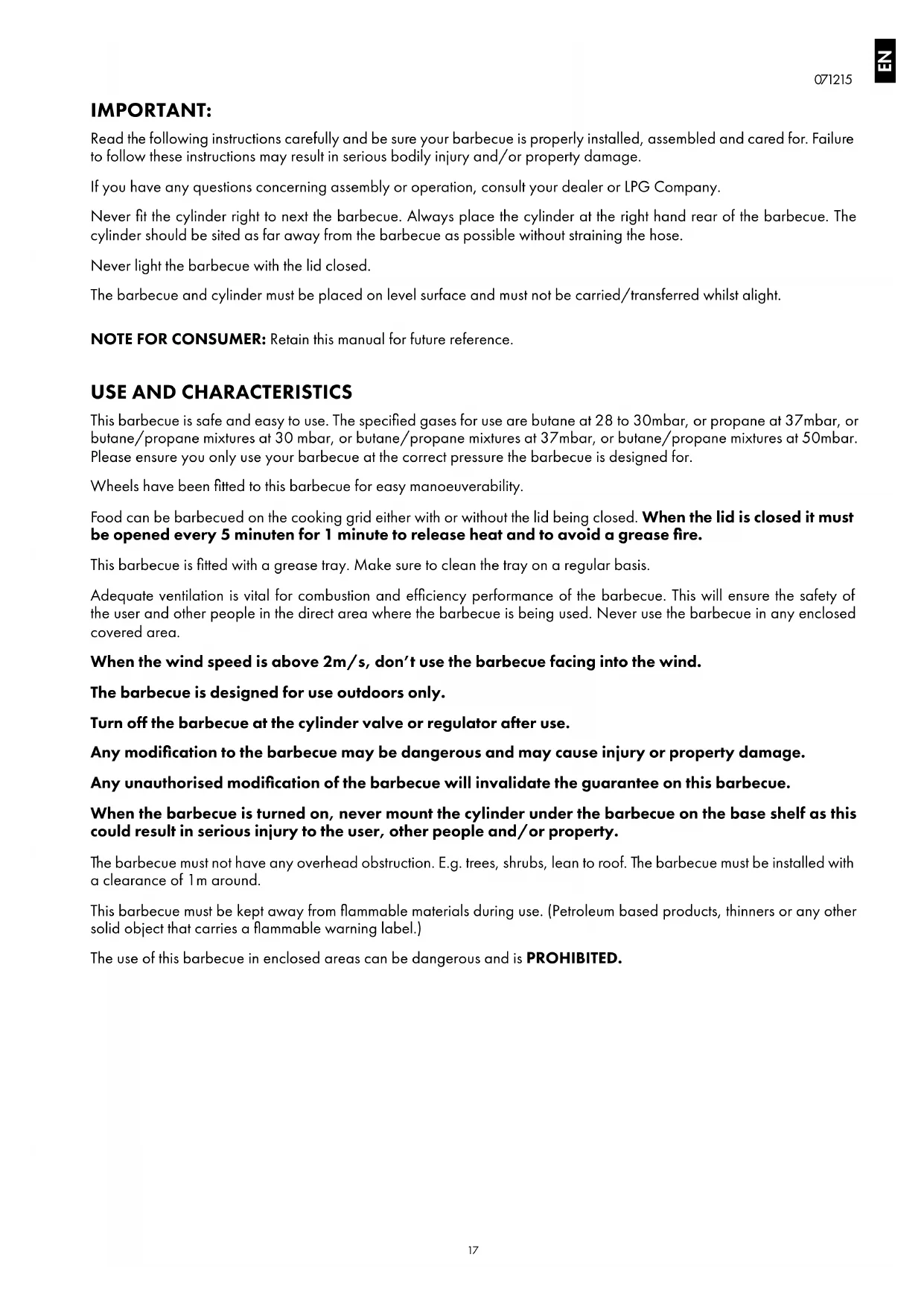 IMPORTANT: Read the following instructions carefully and be sure your barbecue is properly installed, assembled and cared for. Failure to follow these instructions may result in serious bodily injury and/or property damage. If you have any questions concerning assembly or operation, consult your dealer or LPG Company. Never fit the cylinder right to next the barbecue. Always place the cylinder at the right hand rear of the barbecue. The cylinder should be sited as far away from the barbecue as possible without straining the hose. Never light the barbecue with the lid closed. The barbecue and cylinder must be placed on level surface and must not be carried/transferred whilst alight. NOTE FOR CONSUMER: Retain this manual for future reference.