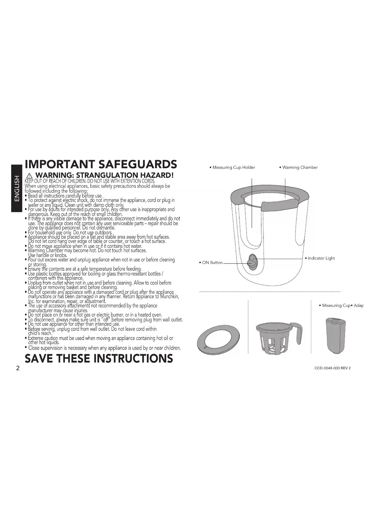 - This product is not intended for use by children and persons with limited physical or mental capabilities unless they have been instructed or supervised on the proper use of this product by a person responsible for their safety. TO CLEAN: Always unplug unit and ensure that it is cool before cleaning. Bottle Warmer Unit: Wipe surface of unit as well as inside of the warming chamber with a damp cloth or sponge using mild liquid soap. Wipe with clear water. Do not submerge unit. Measuring Cup, Basket and Adapter Ring: Dishwasher safe (top rack) or wash with soapy water. Rinse with clear water. Allow to air dry. Do not use scouring pads, abrasives or solvents for cleaning; they may damage the appliance and its surfaces. TO DE-SCALE: It is helpful to de-scale your Bottle Warmer every four weeks to ensure that it continues to work properly. To de-scale, mix 2 oz. (50ml) of white vinegar with 4 oz. (100ml) of cold water and pour into the Warming Chamber. Allow liquid to stand in the unit until any deposits (limescale) have dissolved. Discard liquid and rinse with clear water. Any other servicing should be performed by an authorized service representative. Electrical Rating: Input voltage: 120V AC ~ 60Hz Wattage: 500W Safety Approval: ETL8 9