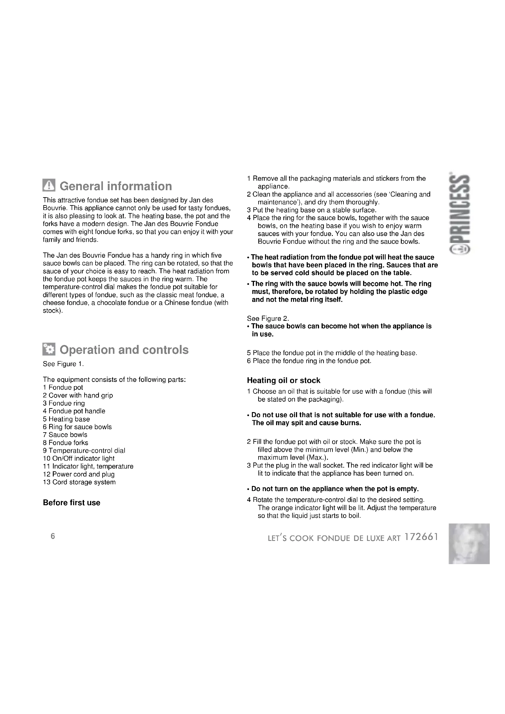 General information This attractive fondue set has been designed by Jan des Bouvrie. This appliance cannot only be used for tasty fondues, it is also pleasing to look at. The heating base, the pot and the forks have a modern design. The Jan des Bouvrie Fondue comes with eight fondue forks, so that you can enjoy it with your family and friends. The Jan des Bouvrie Fondue has a handy ring in which five sauce bowls can be placed. The ring can be rotated, so that the sauce of your choice is easy to reach. The heat radiation from the fondue pot keeps the sauces in the ring warm. The temperature-control dial makes the fondue pot suitable for different types of fondue, such as the classic meat fondue, a cheese fondue, a chocolate fondue or a Chinese fondue (with stock). Operation and controls See Figure 1. The equipment consists of the following parts: 1 Fondue pot 2 Cover with hand grip 3 Fondue ring 4 Fondue pot handle 5 Heating base 6 Ring for sauce bowls 7 Sauce bowls 8 Fondue forks 9 Temperature-control dial 10 On/Off indicator light 11 Indicator light, temperature 12 Power cord and plug 13 Cord storage system Before first use 1 Remove all the packaging materials and stickers from the appliance. 2 Clean the appliance and all accessories (see ‘Cleaning and maintenance’), and dry them thoroughly. 3 Put the heating base on a stable surface. 4 Place the ring for the sauce bowls, together with the sauce bowls, on the heating base if you wish to enjoy warm sauces with your fondue. You can also use the Jan des Bouvrie Fondue without the ring and the sauce bowls.